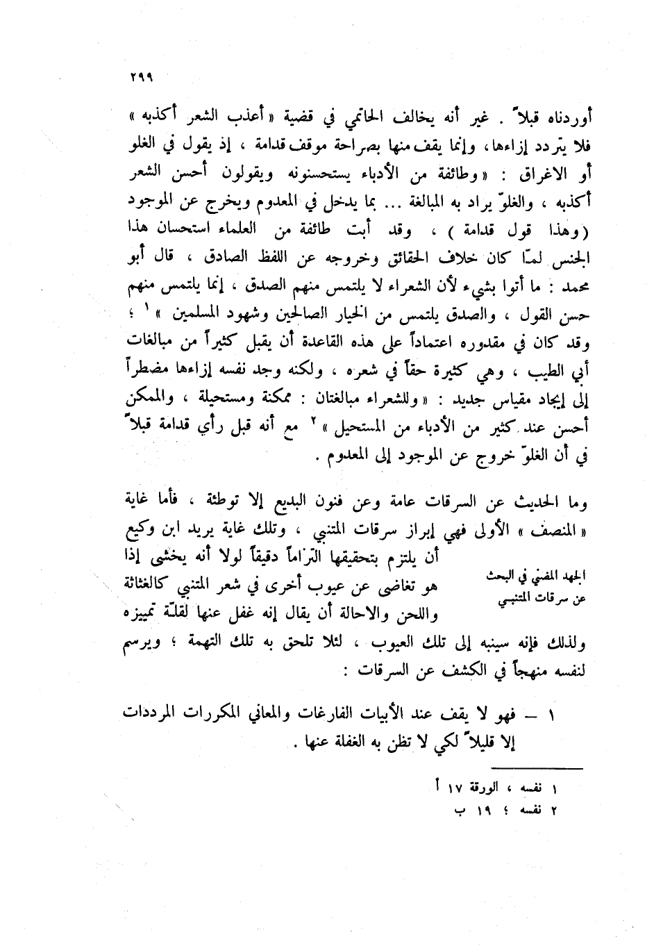 أوردناه قبلاً. غير أنه يخالف الحاتمي في قضية " عذب الشعر أكذبه " فلا يتردد إزاءها، وإنما يقف منها بصراحة موقف قدامة، إذ يقول في الغلو أو الإغراق: " وطائفة من الأدباء يستحسنونه ويقولون أحسن الشعر أكذبه، والغلو يراد به المبالغة؟ بما يدخل في المعدوم ويخرج عن الموجود (وهذا قول قدامة) . وقد أبت طائفة من العلماء استحسان هذا الجنس لما كان خلاف الحقائق وخروجه عن اللفظ الصادق، قال أبو محمد: ما أتوا بشيء لأن الشعراء لا يلتمس من الخيار الصالحين وشهود المسلمين " (1) ؛ وقد كان في مقدوره اعتماداً على هذه القاعدة أن يقبل كثيراً من مبالغات أبي الطيب، وهي كثيرة حقاً في شعره، ولكنه وجد نفسه إزاءها مضطراً إلى إيجاد مقياس جديد: " وللشعراء مبالغتان: ممكنة ومستحيلة، والممكن أحسن عند كثير من الأدباء من المستحيل " (2) مع أنه قبل رأي قدامة قبلاً في أن الغلو خروج عن الموجود إلى المعدوم.