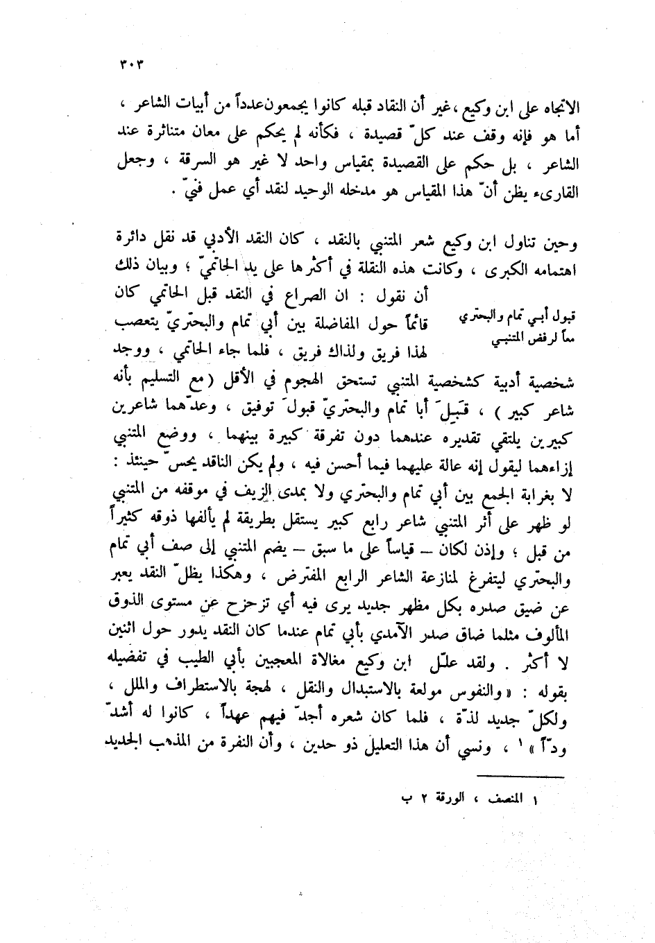 وحين تناول ابن وكيع شعر المتنبي بالنقد، كان النقد الأدبي قد نقل دائرة اهتمامه الكبرى، وكانت هذه النقلة في أكثرها على يد الحاتمي؛ وبيان ذلك أن نقول: ان الصراع في النقد قبل الحاتمي كان قائماً حول المفاضلة بين أبي تمام والبحتري يتعصب لهذا فريق ولذاك فريق، فلما جاء الحاتمي، ووجد شخصية أدبية كشخصية المتنبي تستحق الهجوم في الأقل (مع التسليم بأنه شاعر كبير) ، قبل أبا تمام والبحتري قبول توفيق، وعدهما شاعرين كبيرين يلتقي تقديره عندهما دون تفرقة كبيرة بينهما، ووضع المتنبي إزاءهما ليقول إنه عالة عليهما فيما أحسن فيه، ولم يكن الناقد يحس حينئذ: لا بغرابة الجمع بين أبي تمام والبحتري ولا بمدى الزيف في موقعه من المتنبي لو ظهر على أثر المتنبي شاعر رابع كبير يستقل بطرقة لم يألفها ذوقه كثيراً من قبل، وإذن لكان - قياساً على ما سبق - يضم المتنبي إلى صف أبي تمام والبحتري ليتفرغ لمنازعة الشاعر الرابع المفترض، وهكذا يظل النقد يعبر عن ضيق صدره بكل مظهر جديد يرى فيه أي تزحزح عن مستوى الذوق المألوف مثلما ضاق صدر الآمدي بابي تمام عندما كان النقد يدور حول اثنين لا اكثر. ولقد علل ابن وكيع مغالاة المعجبين بابي الطيب في تفضيله بقوله: " والنفوس مولعة بالاستبدال والنقل، لهجة بالاستطراف والملل، ولكل جديد لذة، فلما كان شعره أجد فيهم عهداً، كانوا له أشد وداً " (1) ، ونسي أن هذا التعليل ذو حدين، وان النفرة من المذهب الجدي