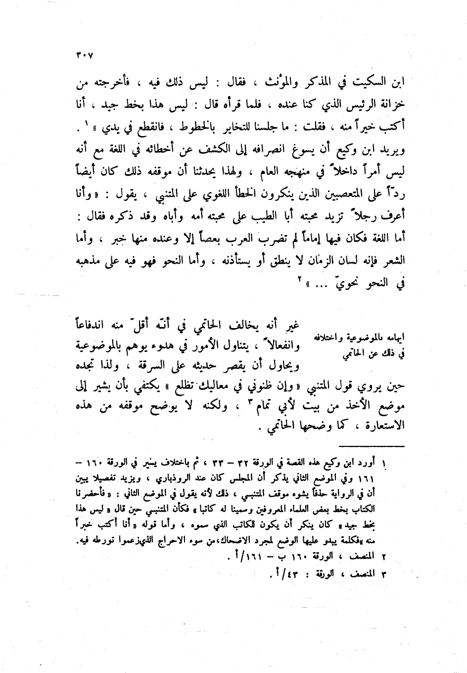 (1) أورد ابن وكيع هذه القصة في الورقة 32 - 33، ثم باختلاف يسير في الورقة 160 - 161 وفي الموضع الثاني يذكر أن المجلس كان عند الروذباري، ويزيد تفصيلا يبين أن في الرواية حذفاً يشوه موقف المتنبي، ذلك لأنه يقول في الموضع الثاني: " فأحضرنا الكتاب بخط بعض العلماء المعروفين وسمينا له كاتباً " فكأن المتنبي حين قال: " ليس هذا بخط جيد " كان ينكر أن يكون للكاتب الذي سموه، وأما قوله " أنا لا أكتب خبراً منه " فكلمة يبدو عليها الوضع لمجرد الإضحاك، من سوء الإحراج الذي زعموا تورطه فيه.