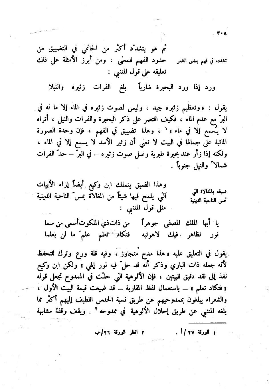 نور تظاهر فيك لاهويته ... فتكاد تعلم علم ما لن يعلمنا يقول في التعليق عليه " هذا مدح متجاوز، وفيه قلة ورع وترك للتحفظ لأنه جعله ذات الباري وذكر انه قد حل فيه نور إلهي " ولكن ابن وكيع نفذ إلى نقد دقيق للبيتين، فإن الألوهية التي حلت في الممدوح تجعل قوله " فتكاد لهم " - باستعمال لفظ المقاربة - قد ضيعت قيمة البيت الاول، والشعراء يبلغون بممدوحيهم عن طريق نسبة الحدس اللطيف إليهم أكثر مما بلغه المتنبي عن طريق إحلال الألوهية في ممدوحه (2) . ويقف وقفة مشابهة