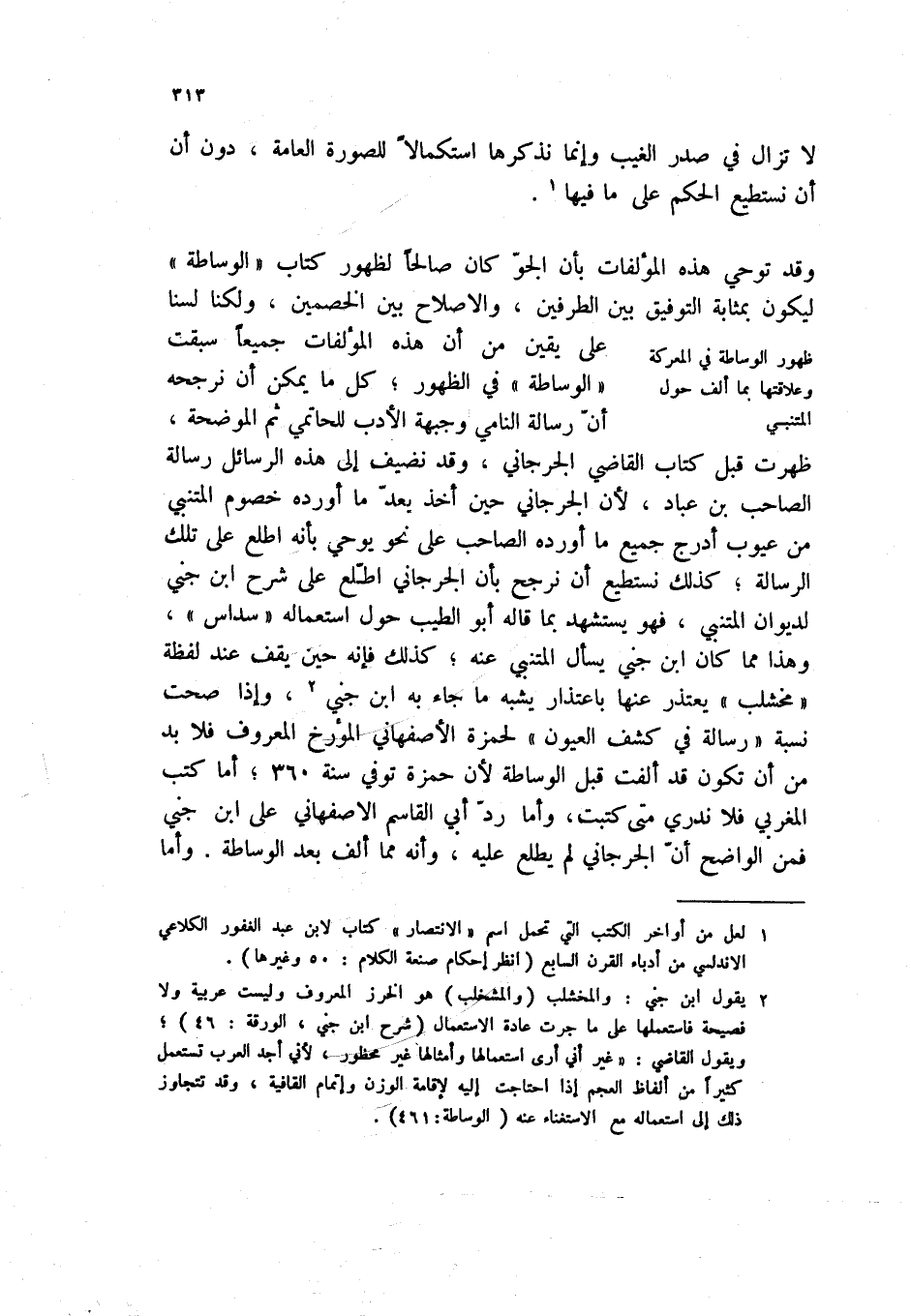 وقد توحي هذه المؤلفات بان الجو كان صالحاً لظهور كتاب " الوساطة " ليكون بمثابة التوفيق بين الطريفين، والاصطلاح بين الخصمين، ولكنا لسنا على يقين من أن هذه المؤلفات جميعاً سبقت " الوساطة " في الظهور؛ كل ما يمكن ان نرجحه أن رسالة النامي وجبهة الأدب للحاتمي ثم الموضحة، ظهرت قبل كتاب القاضي الجرجاني، وقد نضيف إلى هذه الرسائل رسالة الصاحب بن عباد، لان الجرجاني حين اخذ يعد ما أورده خصوم المتنبي من عيوب ادرج جميع ما أورده الصاحب على نحو يوحي بأنه أطلع على تلك الرسالة؛ كذلك نستطيع ان نرجح بان الجرجاني اطلع على شرح ابن جني لديوان المتنبي، فهو يستشهد بما قاله أبو الطيب حول استعماله " سداس "، وهذا مما كان ابن جني يسأل المتنبي عنه؛ كذلك فإنه حين يقف عند لفظة " مخشلب " يعتذر عنها باعتذار يشبه ما جاء به ابن جني (2) ؛ وإذا صحت نسبة " رسالة في كشف العيون " لحمزة الأصفهاني المؤرخ المعروف فلابد من ان تكون قد ألفت قبل الوساطة لان حمزة توفي سنة 360؛ أما كتب المغربي فلا ندري متى كتبت، وأما رد أبي القاسم الاصفهاني على ابن جني فمن الواضح أن الجرجاني لم يطلع عليه، وأنه مما ألف بعد الوساطة. وأما