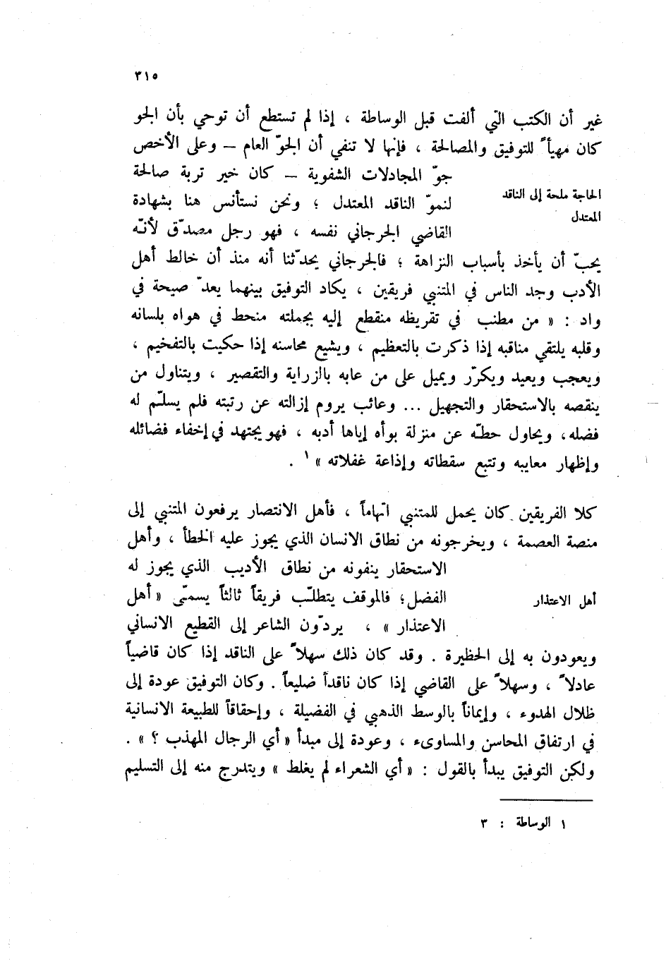 كلا الفريقين كان يحمل للمتنبي اتهاماً، فأهل الانتصار يرفعون المتنبي إلى منصة العصمة، ويخرجونه من نطاق الإنسان الذي يجوز عليه الخطأ، وأهل الإستحقار ينفونه من نطاق الأديب الذي يجوز له الفضل؛ فالموقف يتطلب فريقاً ثالثاً يسمى " أهل الاعتذار "، يردون الشاعر إلى القطيع الإنساني ويعودون به إلى الحظيرة. وقد كان ذلك سهلاً على الناقد إذا كان قاضياً عادلاً، وسهلاً على القاضي إذا كان ناقداً ضليعاً. وكان التوفيق عودة إلى ظلال الهدوء، وإيماناً بالوسط الذهبي في الفضيلة، وإحقاقاً للطبيعة الإنسانية في أرتفاق المحاسن والمساوئ، وعودة إلى مبدأ " ي الرجال المهذب؟ ". ولكن التوفيق يبدأ بالقول: " أي الشعراء لم يغلظ " ويتدرج منه إلى التسليم