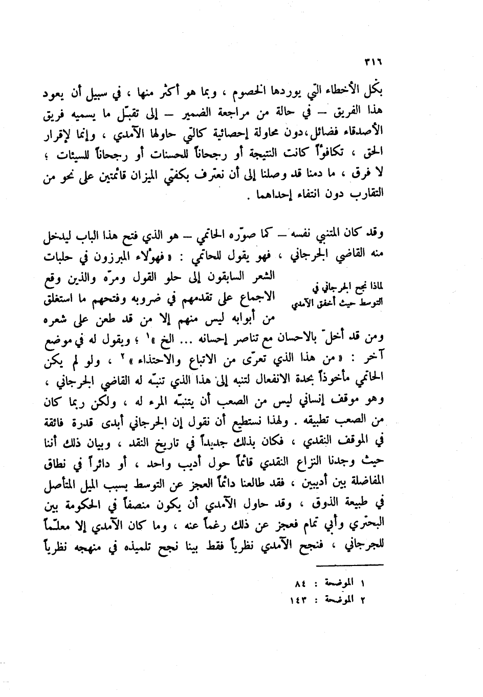 وقد كان المتنبي نفسه - كما صوره الحاتمي - هو الذي فتح هذا الباب ليدخل منه القاضي الجرجاني، فهو يقول للحاتمي: " فهؤلاء المبرزون في حلبات الشعر السابقون إلى حلو القول ومره والذين وقع الإجماع على تقدمهم في ضروبه وفتحهم ما استغلق من أبوابه ليس منهم إلا من قد طعن على شعره ومن قد أخل بالإحسان مع تناصر إحسانه؟ الخ " (1) ؛ ويقول له في موضع آخر: " من هذا الذي تعرى من الاتباع والاحتذاء " (2) ، ولو لم يكن الحاتمي مأخوذاً بحدة الانفعال لتنبه إلى هذا الذي تنبه له القاضي الجرجاني، وهو موقف نساني ليس من الصعب أن يتنبه المرء له، ولكن ربما كان من الصعب تطبيقه. ولهذا نستطيع أن نقول إن الجرجاني أبدى قدرة فائقة في الموقف النقدي، فكان بذلك جديداً في تاريخ النقد، وبيان ذلك أننا حيث وجدنا النزاع النقدي قائماً حول أديب واحد، أو دائراً في نطاق المفاضلة بين أديبين، فقد طالعنا دائماً العجز عن التوسط بسبب الميل المتأصل في طبيعة الذوق، وقد حاول الآمدي أن يكون منصفاً في الحكومة بين البحتري وأبي تمام فعجز عن ذلك رغماً عنه، وما كان الآمدي إلا معلماً للجرجاني، فنجح الآمدي نظرياً فقط بينا نجح تلميذه في منهجه نظرياً