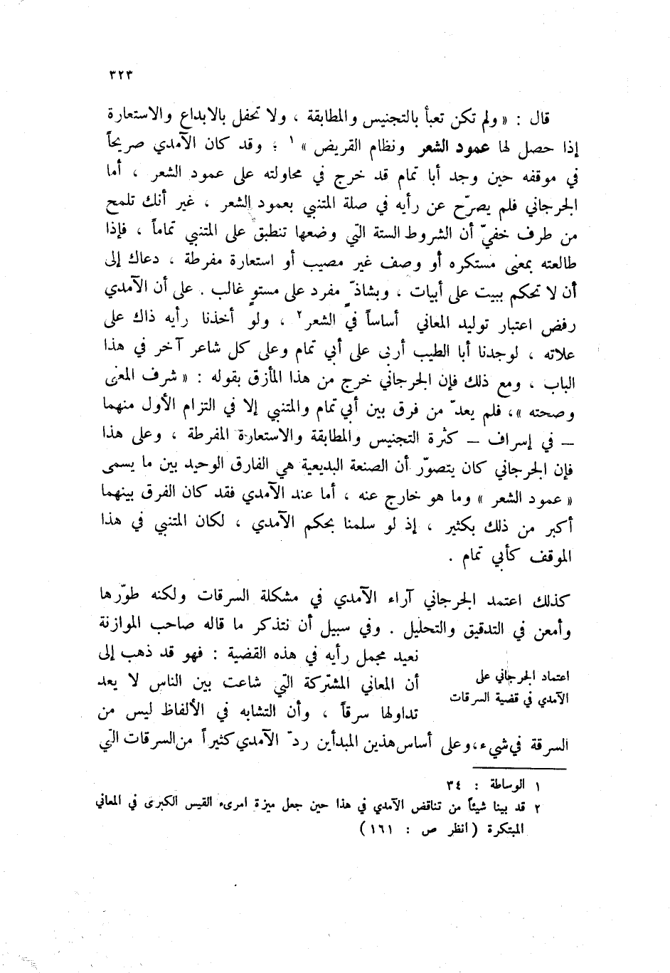قال: " ولم تكن تعبأ بالتجنيس والمطابقة، ولا تحفل بالإبداع والاستعارة إذا حصل لها عمود الشعر ونظام القريض " (1) ؛ وقد كان الآمدي صريحاً في موقفه حين وجد أبا تمام قد خرج في محاولته على عمود الشعر، أما الجرجاني فلم يصرح عن رأيه في صلة المتنبي بعمود الشعر، غير انك تلمح من طرف خفي أن الشروط الستة التي وضعها تنطبق على المتنبي تماماً، فإذا طالعته بمعنى مستكره أو وصف غير مصيب أو استعارة مفرطة، دعاك إلى أن لا تحكم ببيت على أبيات، وبشاذ مفرد على مستو غالب. على أن الآمدي رفض اعتبار توليد المعاني أساساً في الشعر (2) ، ولو أخذنا رأيه ذاك على علاته، لوجدنا أبا الطيب أربى على أبي تمام وعلى كل شاعر آخر في هذا الباب، ومع ذلك فإن الجرجاني خرج من هذا المأزق بقوله: " شرف المعنى وصحته "، فلم يعد من فرق بين أبي تمام والمتنبي إلا في التزام الأول منهما - في إسراف - كثرة التجنيس والمطابقة والاستعارة المفرطة، وعلى هذا فغن الجرجاني كان يتصور أن الصنعة البديعية هي الفارق الوحيد بين ما يسمى " عمود الشعر " وما هو خارج عنه، أما عند الآمدي فقد كان الفرق بينهما أكبر من ذلك بكثير، إذ لو سلمنا بحكم الآمدي، لكان المتنبي في هذا الموقف كأبي تمام.