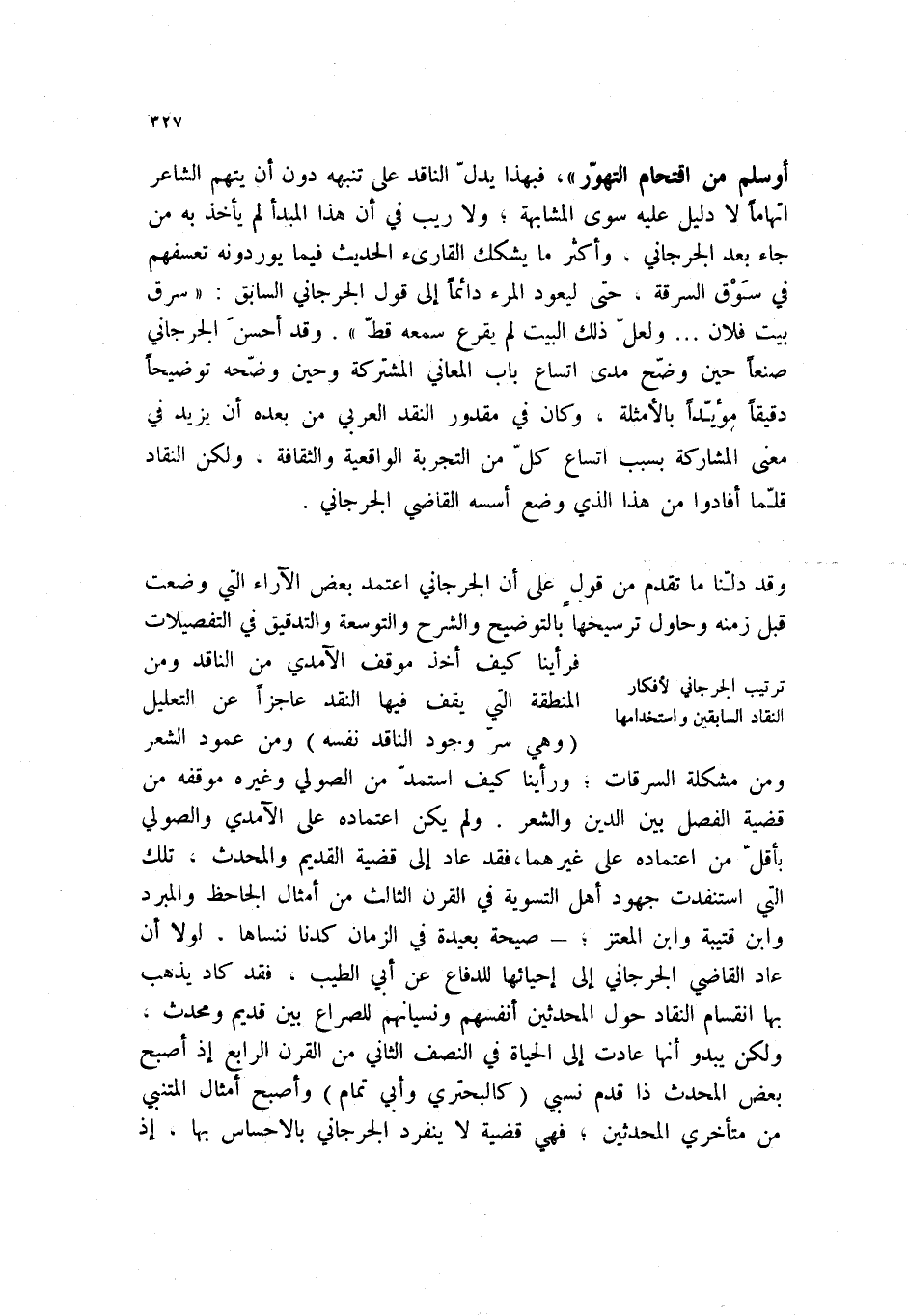 أوسلم من اقتحام التهور "، فبهذا يدل الناقد على تنبهه دون ان يتهم الشاعر اتهاماً لا دليل عليه سوى المشابهة؛ ولا ريب في أن هذا المبدأ لم يأخذ به من جاء بعد الجرجاني، وأكثر ما يشكك القارئ الحديث فيما يوردونه تعسفهم في سوق السرقة، حتى ليعود المرء دائماً إلى قول الجرجاني السابق: " سرق بيت فلان؟ ولعل ذلك البيت لم يقرع سمعه قط ". وقد أحسن الجرجاني صنعاً حين وضح مدى اتساع باب المعاني المشتركة وحين وضحه توضيحاً دقيقاً مؤيداً بالأمثلة، وكان في مقدور النقد العربي من بعده ان يزيد في معنى المشاركة بسبب اتساع كل من التجربة الواقعية والثقافة. ولكن النقاد قلما أفادوا من هذا الذي وضع أسسه القاضي الجرجاني.