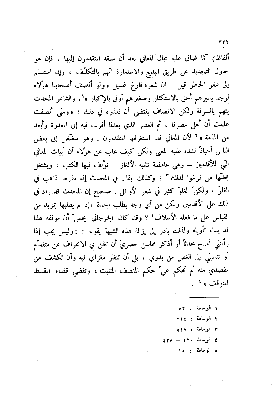 ألفاظ) كما ضاق عليه مجال بعد أن سبقه المتقدمون إليها، فغن هو حاول التجديد عن طريق البديع والاستعارة اتهم بالتكلف، وإن استسلم إلى عفو الخاطر قيل: ان شعره فارغ غسيل " ولو أنصف أصحابنا هؤلاء لوجد يسيرهم أحق بالاستكثار وصغيرهم أولى بالإكبار " (1) ؛ والشاعر المحدث يتهم بالسرقة ولكن الإنصاف يقتضي أن نعذره في ذلك: " ومتى أنصفت علمت أن هل عصرنا، ثم العصر بعدنا أقرب فيه إلى المعذرة وابعد من المذمة " (2) لأن المعاني قد استغرقها المتقدمون. وهو مبغض إلى بعض الناس أحياناً لشدة طلبه المعنى ولكن كيف غاب عن هؤلاء أن أبيات المعاني التي للأقدمين - وهي غامضة تشبه الألغاز - تؤلف فيها الكتب، ويشتغل بحلها من فرغوا لذلك (3) ؛ وكذلك يقال في المحدث إنه مفرط ذاهب في الغلو، ولكن الغلو كثير في شعر الأوائل. صحيح عن المحدث قد زاد في ذلك على الاقمدين ولكن من أي وجه يطلب الجدة، إذا لم يطلبها بمزيد من القياس على ما فعله الأسلاف (4) ؟ وقد كان الجرجاني يحس أن موقفه هذا قد يساء تأويله ولذلك بادر إلى إزالة هذه الشبهة بقوله: " وليس يجب إذا رأيتني امدح محدثاً أو اذكر محاسن حضري أن تظن بي الانحراف عن متقدم أو تنسبني إلى الغض من بدوي، بل أن تنظر مغزاي فيه وان تكشف عن مقصدي منه ثم تحكم علي حكم المنصف المتثبت، وتقضي قضاء المقسط المتوقف " (5) .