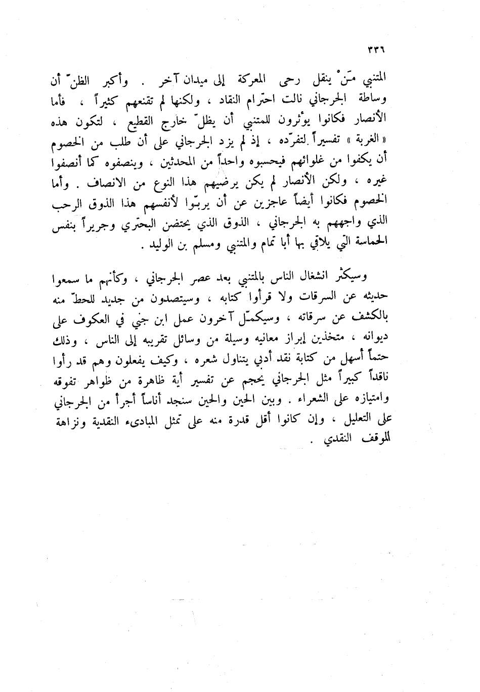 المتنبي من ينقل رحى المعركة إلى ميدان آخر. وأكبر الظن ان وساطة الجرجاني نالت احترام النقاد، ولكنها لم تقنعهم كثيراً، فأما الأنصار فكانوا يؤثرون للمتنبي أن يظل خارج القطيع، لتكون هذه " الغربة " تفسيراً لتفرده، إذ لم يزد الجرجاني على أن طلب من الخصوم أن يكفوا من غلوئهم فيحسبوه واحداً من المحدثين، وينصفوه كما انصفوا غيره، ولكن الأنصار لم يكن يرضيهم هذا النوع من الإنصاف. فأما الخصوم فكانوا أيضاً عاجزين عن أن يربوا لأنفسهم هذا الذوق الرحب الذي واجههم به الجرجاني، الذوق الذي يحتضن البحتري وجريراً بنفس الحماسة التي يلاقي بها أبا تمام والمتنبي ومسلم بن الوليد.
