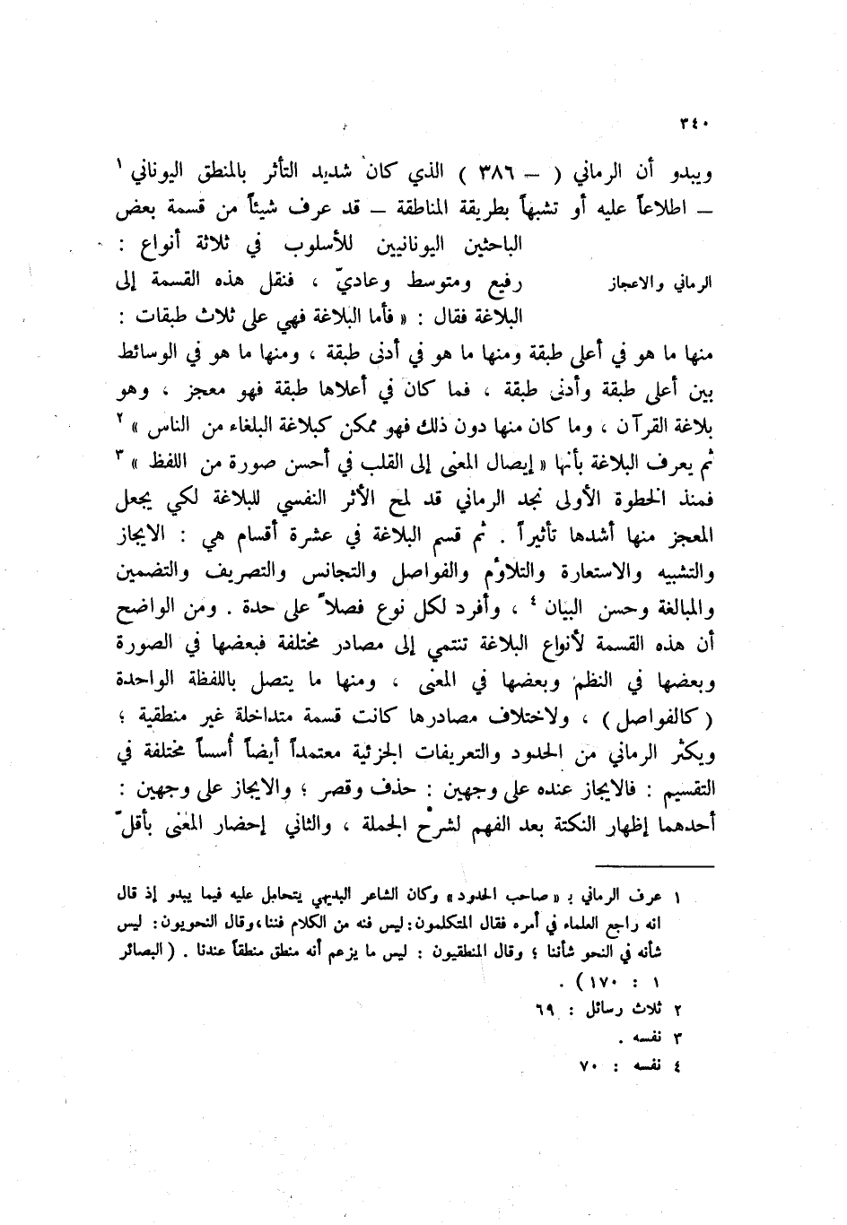 (1) عرف الرماني ب " صاحب الحدود " وكان الشاعر البديهي يتحامل عليه فيما يبدو إذ قال انه راجع العلماء في أمره فقال المتكلمون: ليس فنه من الكلام فننا، وقال النحويون: ليس شانه في النحو شأننا؛ وقال المنطقيون: ليس ما يزعم أنه منطق منطقاً عندنا. (البصائر 1: 170) .