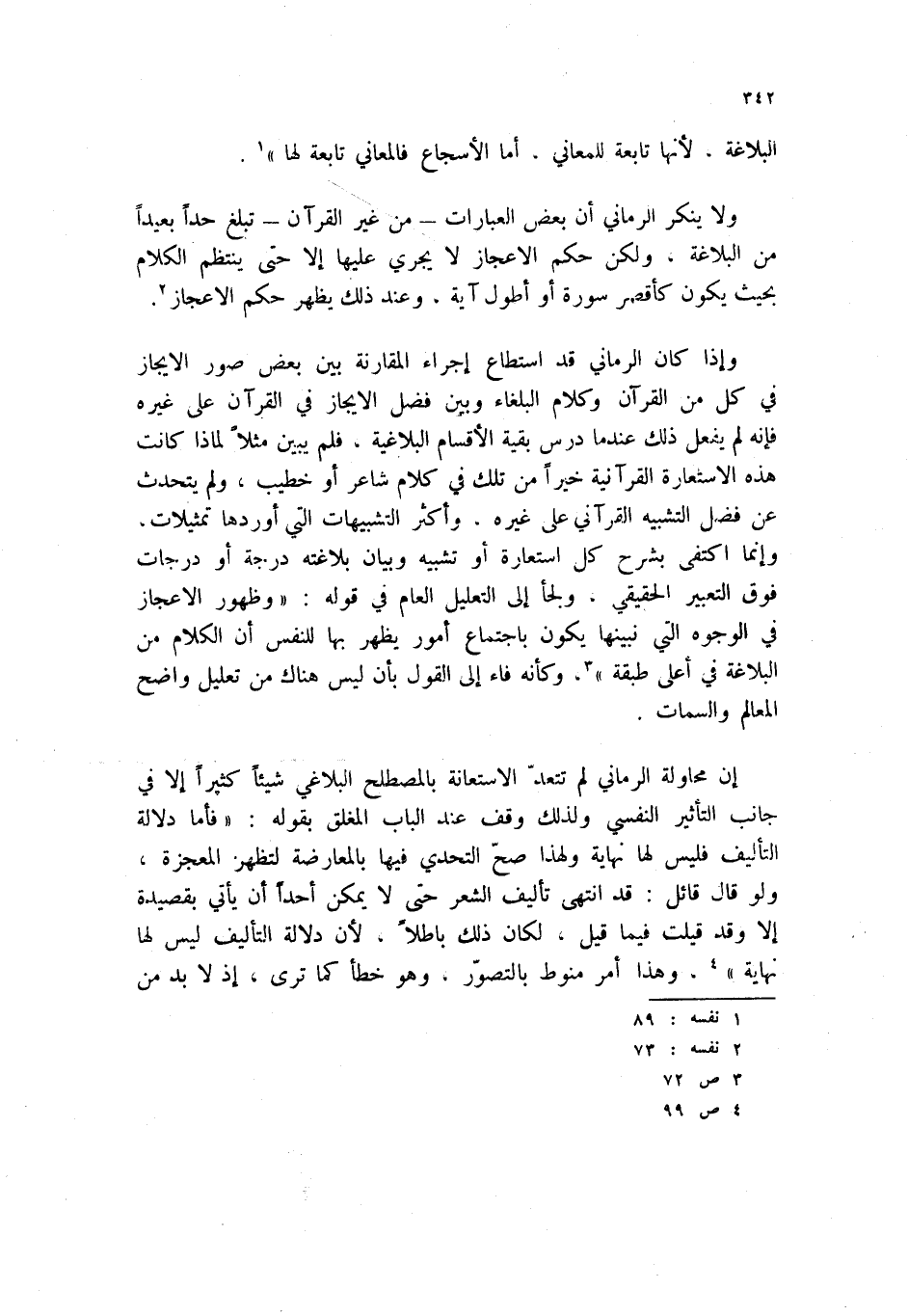 ولا ينكر الرماني أن بعض العبارات - من غير القرآن - تبلغ حداً بعيداً من البلاغة، ولكن حكم الإعجاز لا يجري عليها غلا حتى ينتظم الكلام بحيث يكون كأقصر سورة او أطول آية، وعند ذلك يظهر حكم الإعجاز (2) .