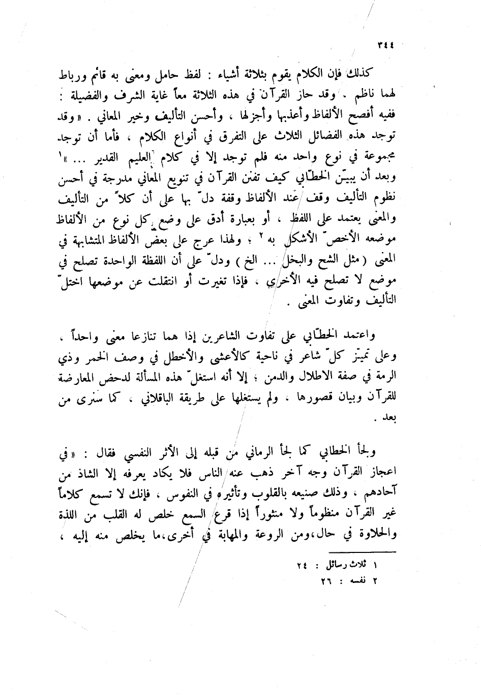 كذلك فإن الكلام يقوم بثلاثة أشياء: لفظ حامل ومعنى به قائم ورباط لهما ناظم، وقد حاز القرآن في هذه الثلاثة معاً غاية الشرف والفضيلة: ففيه أفصح الألفاظ وأعذبها وأجزلها، واحسن التأليف وخير المعاني. " وقد توجد هذه الفضائل الثلاث على التفرق في أنواع الكلام، فأما أن توجد مجموعة في نوع واحد منه فلم توجد إلا في كلام العليم القدير؟ " (1) وبعد أن يبين الخطابي كيف تفنن القرآن في تنويع المعاني مدرجة في أحسن نظوم التأليف وقف عند الألفاظ وقفة دل بها على أن كلاً من التأليف والمعنى يعتمد على اللفظ، أو بعبارة أدق على وضع كل نوع من الألفاظ موضعه الأخص الأشكل به (2) ؛ ولهذا عرج على بعض الألفاظ المتشابهة في المعنى (مثل الشح والبخل.. الخ) ودل على أن اللفظة الواحدة تصلح في موضع لا تصلح فيه الأخرى، فإذا تغيرت أو انتقلت عن موضعها اختل التأليف وتفاوت المعنى.