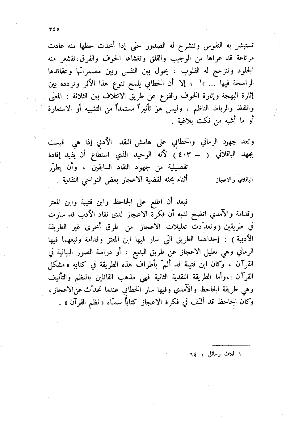 وتعد جهود الرماني والخطابي على هامش النقد الأدبي إذا هي قيست بجهد الباقلاني (- 403) لأنه الوحيد الذي استطاع أن يفيد إفادة تفصيلية من جهود النقاد السابقين، وأن يطور أثناء بحثه لقضية الإعجاز بعض النواحي النقدية.