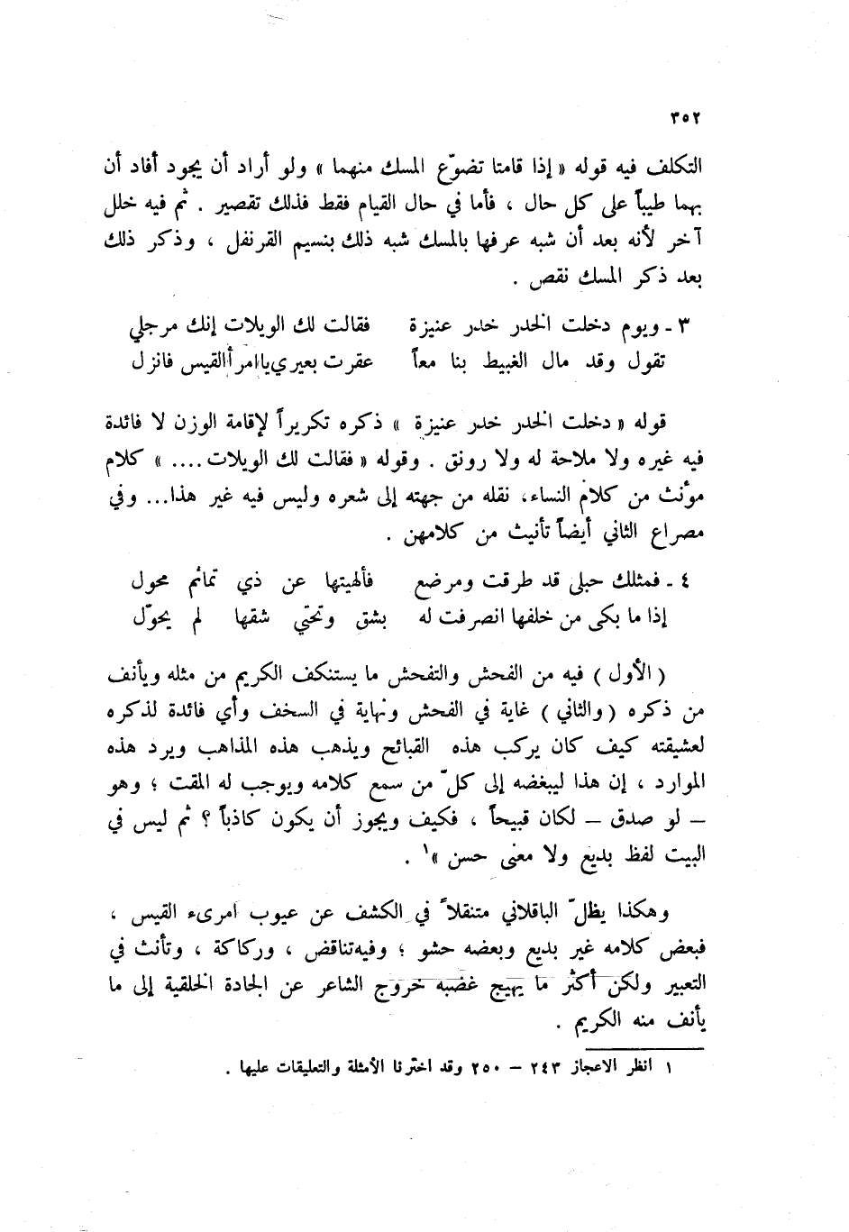 وهكذا يظل الباقلاني متنقلاً في الكشف عن عيوب امرئ القيس، فبعض كلامه غير بديع وبعضه حشو؛ وفيه تناقض، وركاكة، وتأنث في التعبير ولكن أكثر ما يهيج غضبه خروج الشاعر عن الجادة الخلقي إلى ما يأنف منه الكريم.