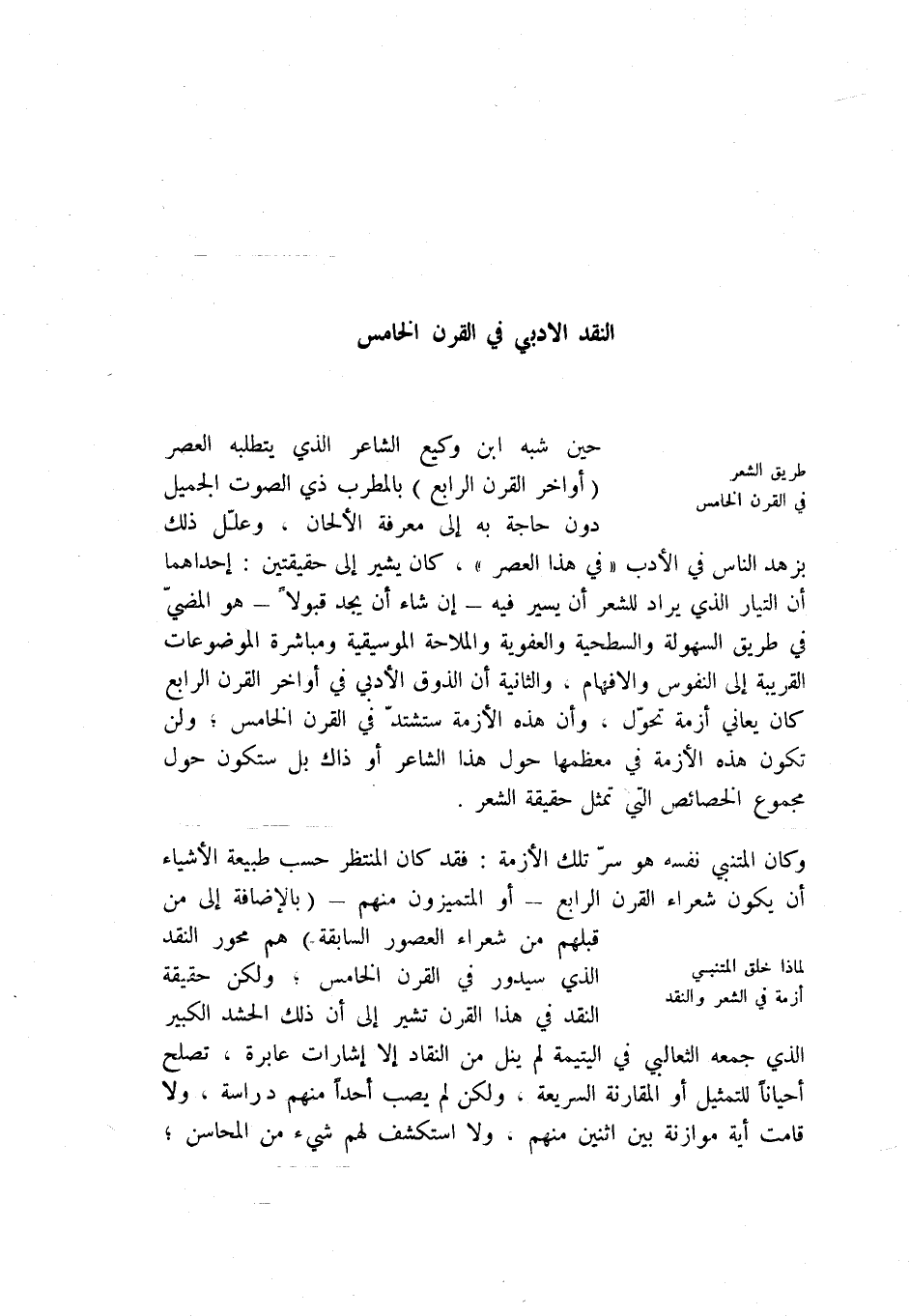 وكان المتنبي نفسه هو سر تلك الأزمة: فقد كان المنتظر حسب طبيعة الأشياء أن يكون شعراء القرن الرابع - أو المتميزون منهم - (بالإضافة إلى من قبلهم من شعراء العصور السابقة) هم محور النقد الذي سيدور في القرن الخامس؛ ولكن حقيقة النقد في هذا القرن تشير إلى ان ذلك الحشد الكبير الذي جمعه الثعالبي في اليتيمة لم ينل من النقاد إلا إشارات عابرة، تصلح أحياناً للتمثيل أو المقارنة السريعة، ولكن لم يصب أحداً منهم دراسة، ولا قامت أية موازنة بين اثنين منهم، ولا استكشف لهم شيء من المحاسن؛