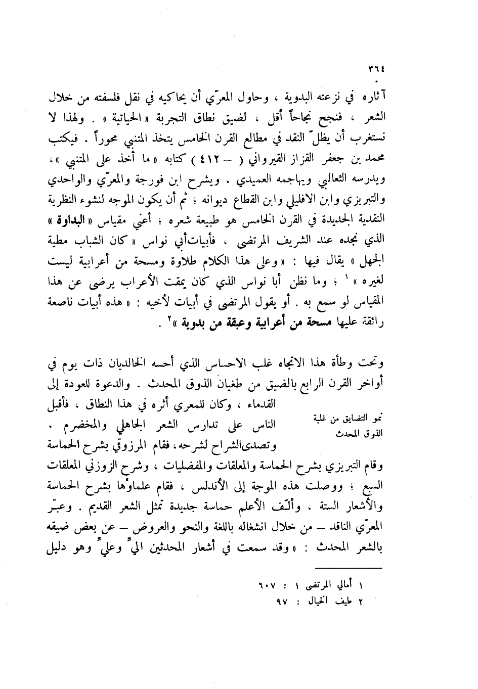 آثاره في نزعته البدوية، وحاول المعري أن يحاكيه في نقل فلسفته من خلال الشعر، فنجح نجاحاً اقل، لضيق نطاق التجربة " الحياتية ". ولهذا لا نستغرب أن يظل النقد في مطالع القرن الخامس يتخذ المتنبي محوراً، فيكتب محمد بن جعفر القزاز القيرواني (- 412) كتابه " ما اخذ على المتنبي "، ويدرسه الثعالبي ويهاجمه العميدي، ويشرح ابن فورجة والمعري لنشوء النظرية والتبريزي وابن الافليلي وابن القطاع ديوانه؛ ثم أن يكون الموجه لنشوء النظرية النقدية الجديدية في القرن الخامس هو طبيعة شعره؛ اعني مقياس " البداوة " الذي نجده عند الشريف المرتضى، فأبيات أبي نواس " كان الشباب مطية الجهل " يقال فيها: " وعلى هذا الكلام طلاوة ومسحة من أعرابية ليست لغيره " (1) ؛ وما نظن أبا نواس الذي كان يمقت الأعراب يرضى عن هذا المقياس لو سمع به. أو يقول المرتضى في أبيات لأخيه: " هذه أبيات ناصعة رائقة عليها مسحة من أعرابية وعبقة من بدوية " منهاج البلغاء: 10. (2) .