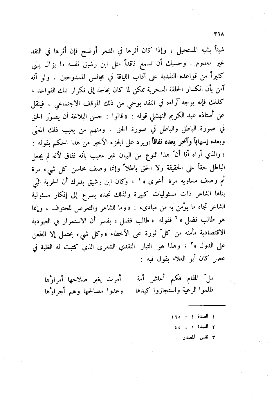 " والذي أراه أنا أن هذا النوع من البيان غير معيب بأنه نفاق لأنه لم يجعل الباطل حقاً على الحقيقة ولا الحق باطلاً وإنما وصف محاسن كل شيء مرة ثم وصف مساويه مرة أخرى " (1) ؛ وكان ابن رشيق يدرك ان الحرية التي ينالها الشاعر ذات مسئوليات كبيرة ولذلك نجده يسرع إلى إنكار مسئولية الشاعر تجاه ما يؤمن به من مبادئ: " وما للشاعر والتعرض للحتوف، وإنما هو طالب فضل " (2) فقوله " طالب فضل " يفسر أن الاستمرار في العبودية الاقتصادية مأمنه من كل ثورة على الأخطاء " وكل شيء يحتمل إلا الطعن على الدول " (3) ؛ وهذا هو التيار النقدي الشعري الذي كتبت له الغلبة في عصر كان أبو العلاء يقول فيه: