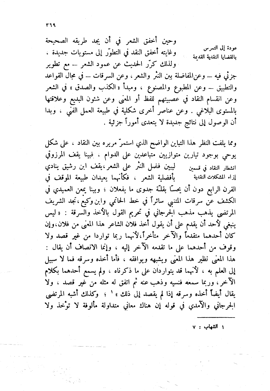 ومما يلفت النظر هذا التباين الواضح الذي استمر مريره بين النقاد، على شكل يوحي بوجود تيارين متوازيين متباعدين على الدوام، فبينا يقف المرزوق ليبين فضل النثر على الشعر، يقف ابن رشيق ينادي بأفضلية الشعر، فكأنهما يعيدان طبيعة الموقف في القرن الرابع دون أن يحسا بقلة جدوى ما يفعلان؛ وبينا يمعن العميدي في الكشف عن سرقات المتنبي سائراً في خط الحاتمي وابن وكيع، تجد الشريف المرتضي يذهب الجرجاني في تحريم القول بالأخذ والسرقة: " ليس ينبغي لأحد أن يقدم على أن يقول أخذ فلان الشاعر هذا المعنى من فلان، وإن كان أحدهما متقدماً والآخر متاخراً، لانهما ربما تواردا من غير قصد ولا وقوف من أحدهما على ما تقدمه الآخر إليه، وإنما الإنصاف أن يقال: هذا المعنى نظير هذا المعنى ويشبهه ويوافقه، فأما أخذه وسرقه فما لا سبيل إلى العلم به، لأنهما قد يتواردان على ما ذكرناه، ولم يسمع أحدهما بكلام الآخر، وربما سمعه فنسيه وذهب عنه ثم اتفق له مثله من غير قصد، ولا يقال أيضاً أخذه وسرقه إذا لم يقصد إلى ذلك " (1) ؛ وكذلك أشبه المرتضى الجرجاني والآمدي في قوله عن هناك معاني متداولة مألوفة لا تؤخذ ولا