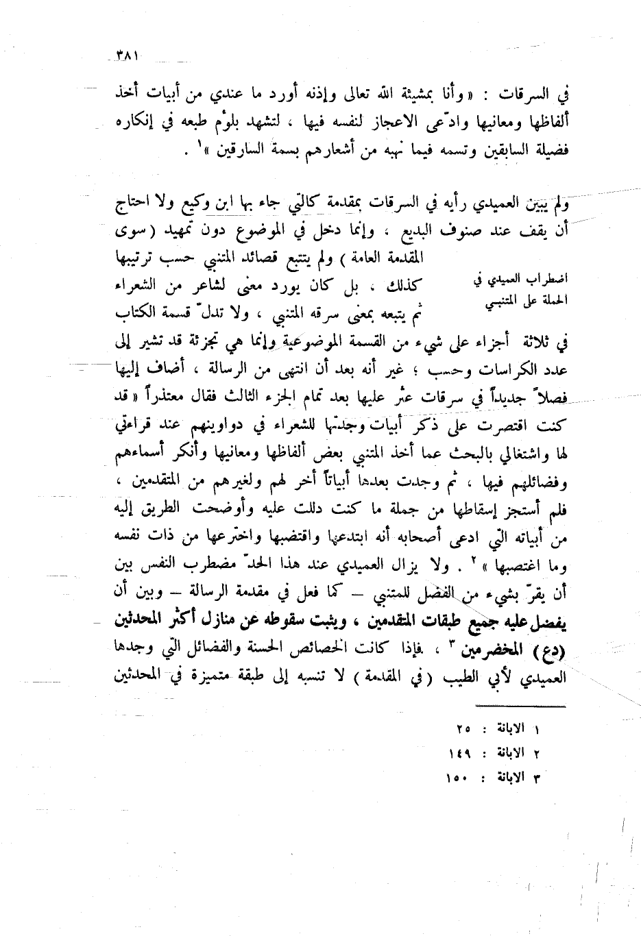 ولم يبين العميدي رأيه في السرقات بمقدمة كالتي جاء بها ابن وكيع ولا احتاج أن يقف عند صنوف البديع، وإنما دخل في الموضوع دون تمهيد (سوى المقدمة العامة) ولم يتتبع قصائد المتنبي حسب ترتيبها كذلك، بل كان يورد معنى لشاعر من الشعراء ثم يتبعه بمعنى سرقه المتنبي، ولا تدل قسمة الكتاب في ثلاثة أجزاء على شيء من القسمة الموضوعية وغنما هي تجزئة قد تشير إلى عدد الكراسات وحسب؛ غير أنه بعد ان انتهى من الرسالة، أضاف إليها فصلاً جديدياً في سرقات عثر عليها بعد تمام الجزء الثالث فقال معتذراً " قد كنت اقتصرت على ذكر أبيات وجدتها للشعراء في دواوينهم عند قراءتي لها واشتغالي بالبحث عما أخذ المتنبي بعض ألفاظها ومعانيها وأنكر أسماءهم وفضائلهم فيها، ثم وجدت بعدها أبياتاً أخر لهم ولغيرهم من المتقدمين، فلم أستجز إسقاطها من جملة ما كنت دللت عليه وأوضحت الطريق غليه من أبياته التي ادعى أصحابه انه ابتدعها واقتضبها واخترعها من ذات نفسه وما اغتصبها " (2) . ولا يزال العميدي عند هذا الحد مضطرب النفس بين أن يقر بشيء من الفضل للمتنبي - كما فعل في مقدمة الرسالة - وبين أن يفضل عليه جميع طبقات المتقدمين، ويثبت سقوطه عن منازل أكثر المحدثين (دع) المخضرمين (3) ، فإذا كانت الخصائص الحسنة والفضائل التي وجدها العميدي لأبي الطيب (في المقدمة) لا تنسبه إلى طبقة متميزة في المحدثين