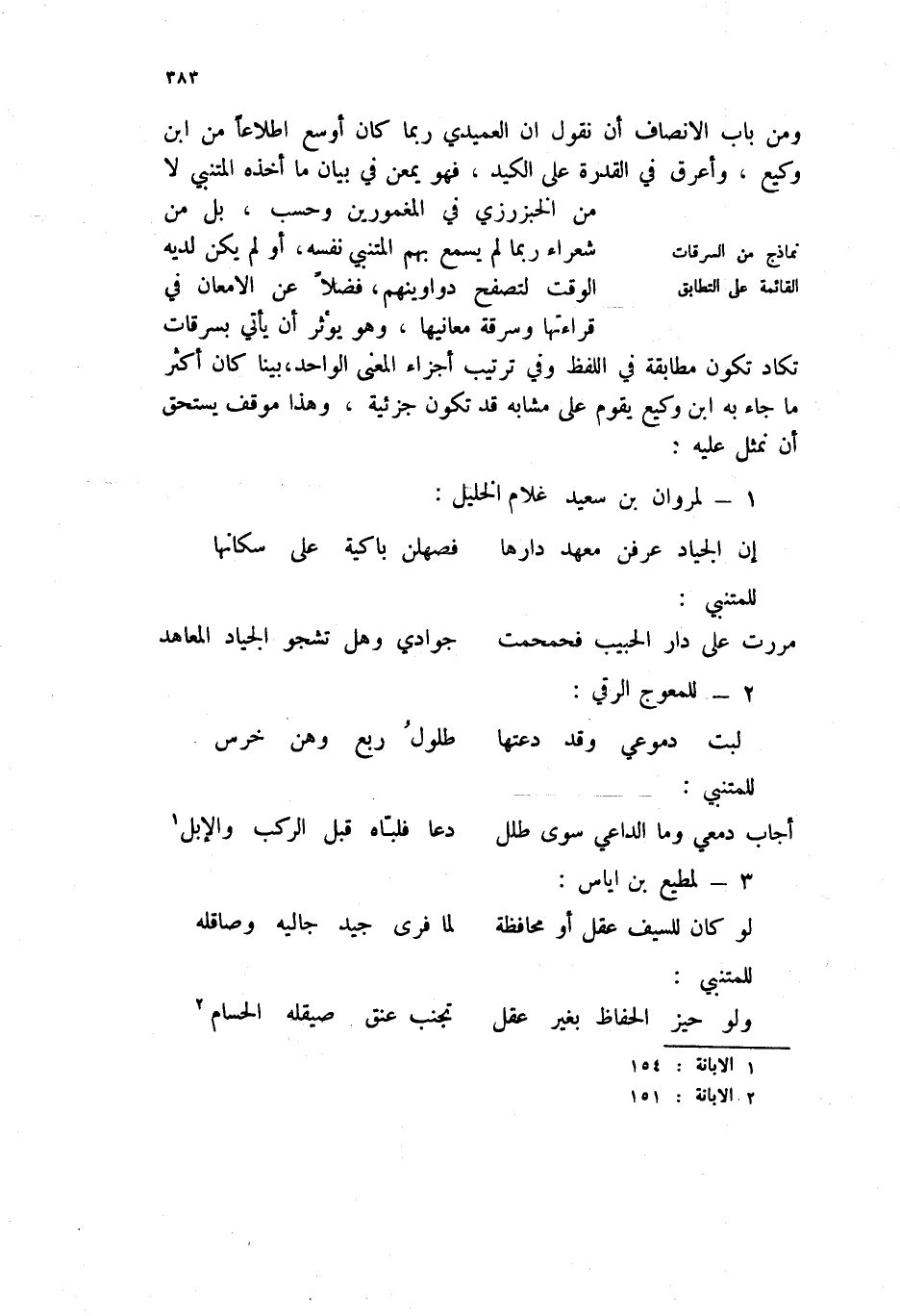 ومن باب الإنصاف أن نقول أن العميدي ربما كان أوسع اطلاعاً من ابن وكيع، واعرق في القدرة على الكيد، فهو يمعن في بيان ما أخذه المتنبي لا من الخبزرزي في المغمورين وحسب، بل من شعراء ربما لم يسمع بهم المتنبي نفسه، أو لم يكن لديه الوقت لتصفح دواوينهم، فضلاً عن الإمعان في قراءتها وسرقة معانيها، وهو يؤثر أن يأتي بسرقات تكاد تكون مطابقة في اللفظ وفي ترتيب أجزاء المعنى الواحد، بينا كان اكثر ما جاء به ابن وكيع يقوم على مشابه قد تكون جزئية، وهذا موقف يستحق أن نمثل عليه: