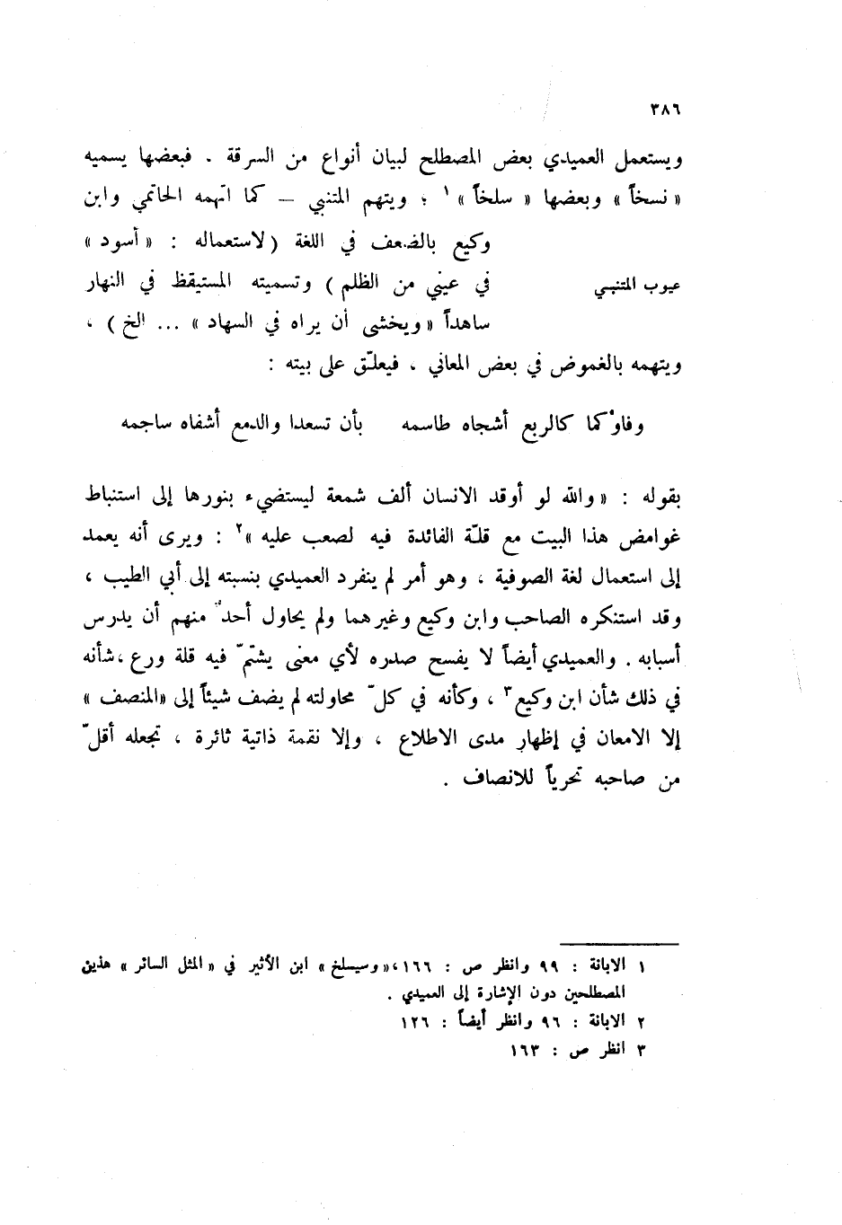 وفاؤكما كالربع أشجاه طاسمه ... بان تسعدا والدمع أشفاه ساجمه بقوله: " والله لو أوقد الإنسان ألف شمعة ليستضيء بنورها إلى اتنباط غوامض هذا البيت مع قلة الفائدة فيه لصعب عليه " (2) : ويرى انه يعمد إلى استعمال لغة الصوفية، وهو أمر لم ينفرد العميدي بنسبته إلى أبي الطيب، وقد استنكره الصاحب وابن وكيع وغيرهما ولم يحاول أحد منهم أن يدرس أسبابه. والعميدي أيضاً لا يفسح صدره لأي معنى يشتم فيه قلة ورع، شأنه في ذلك شأن ابن وكيع (3) ، وكأنه في كل محاولته لم يضف شيئاً إلى " المنصف " إلا الإمعان في إظهار مدى الاطلاع، وإلا نقمة ذاتية ثائرة، تجعله أقل من صاحبه تحرياً للأنصاف.