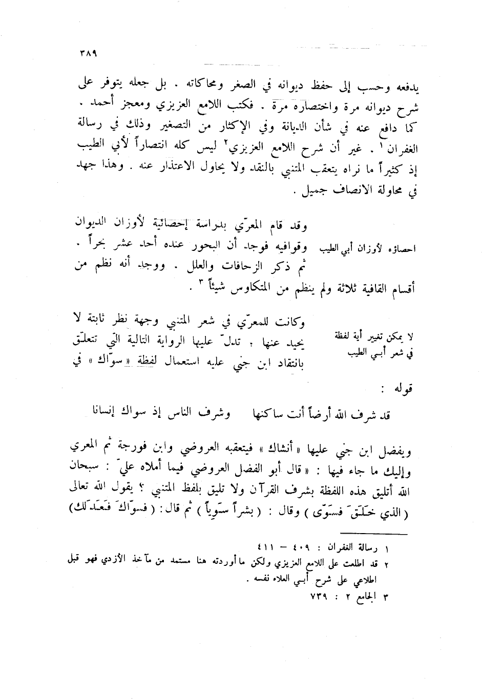 (2) قد اطلعت على اللامع العزيزي ولكن ما أوردته هنا مستمد من مآخذ الأزدي فهو قبل اطلاعي على شرح أبي العلاء نفسه.
