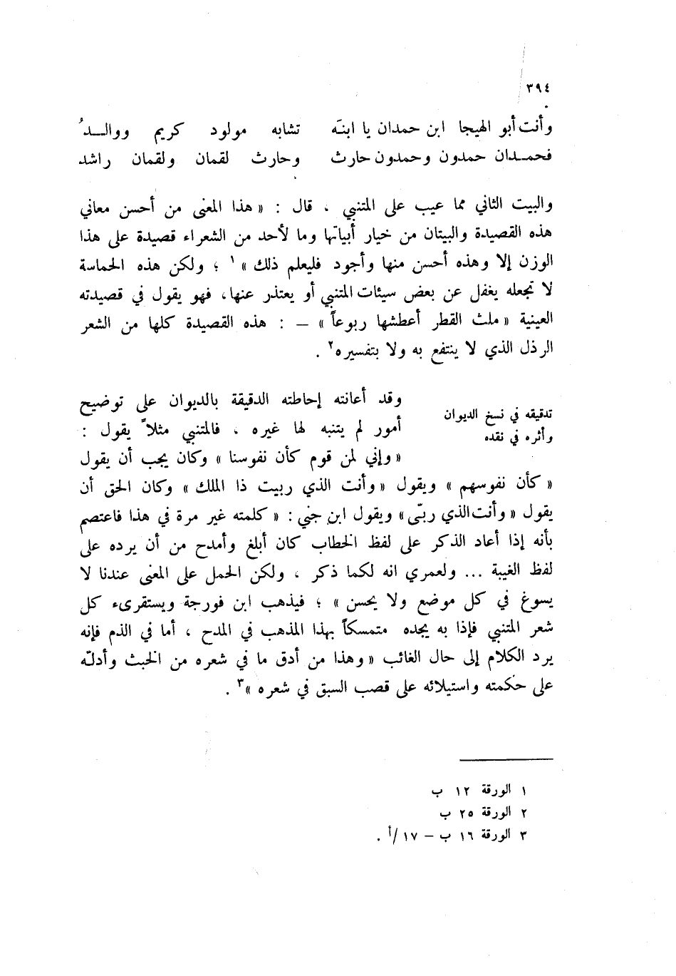 فحمدان حمدون وحمدون حارث ... وحارث لقمان ولقمان راشد والبيت الثاني مما عيب على المتنبي، قال: " هذا المعنى من أحسن معاني هذه القصيدة والبيتان من خيار أبياتها وما لأحد من الشعراء قصيدة على هذا الوزن إلا وهذه أحسن منها وأجود فليعلم ذلك " (1) ؛ ولكن هذه الحماسة لا تجعله يغفل عن بعض سيئات المتنبي أو يعتذر عنها، فهو يقول في قصيدته العينية " ملث القطر أعطشها ربوعاً " -: هذه القصيدة كلها من الشعر الرذل الذي لا ينتفع به ولا بتفسيره (2) .
