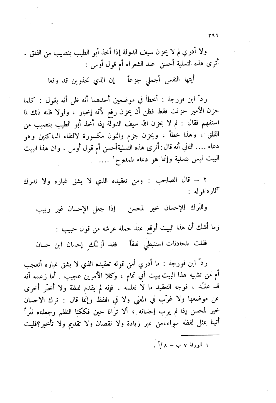 أيتها النفس أجملي جزعاً ... إن الذي تحذرين قد وقعا رد ابن فورجة: أخطأ في موضعين أحدهما انه ظن انه يقول: كلما حزن الأمير حزنت فقط فظن أن يحزن رفع لأنه إخبار. ولولا ظنه ذلك لما استفهم فقال: لم لا يحزن الله سيف الدولة إذا أخذ أبو الطيب بنصيب من القلق، وهذا خطأ، ويحزن جزم والنون مكسورة لالتقاء الساكنين وهو دعاء؟. الثاني انه قال: أترى هذه التسلية احسن أم قول أوس، وأن هذا البيت ليس بتسلية وإنما هو دعاء للمدوح (1) ؟.