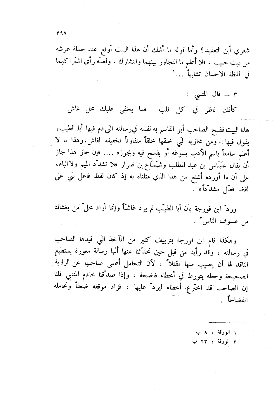 وهكذا قام ابن فورجة بتزييف كثير من المآخذ التي قيدها الصاحب في رسالته، وقد رأينا من قبل حين تحدثنا عنها إنها رسالة معورة يستطيع الناقد لها أن يصيب منها مقتلاً، لان التحامل أعمى صاحبها عن الرؤية الصحيحة وجعله يتورط في أخطاء فاضحة، وإذا صدقنا خادم المتنبي قلنا عن الصاحب قد اخترع اخطاه ليرد عليها، فزاد موقفه ضعفاً وتحامله انفضاحاً.
