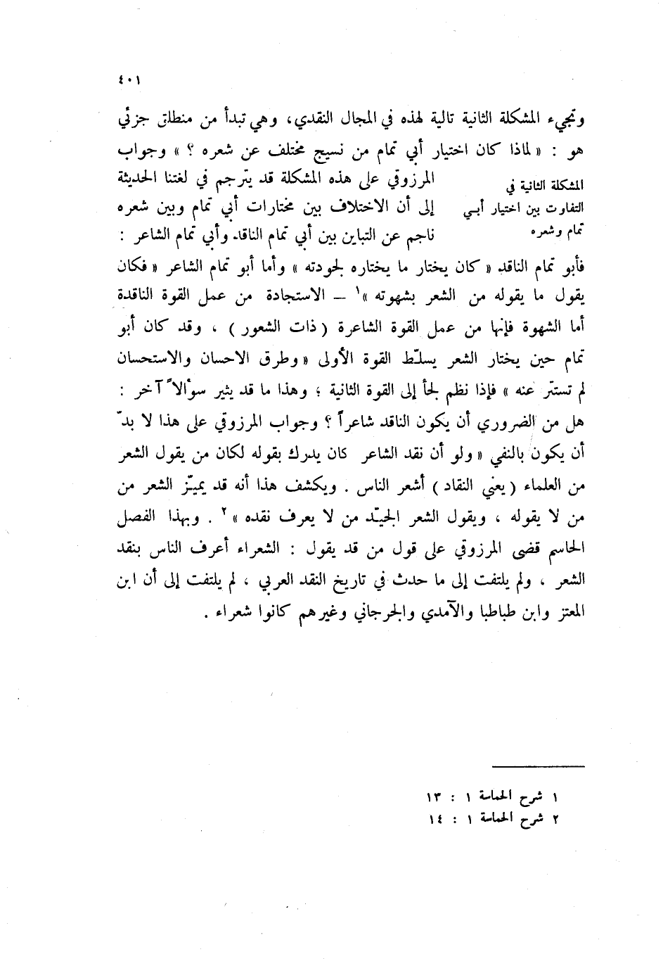 وتجيء المشكلة الثانية تالية لهذه في المجال النقدي، وهي تبدأ من منطلق جزئي هو: " لماذا كان اختيار أبي تمام من نسيج مختلف عن شعره؟ " وجواب المرزوقي على هذه المشكلة قد يترجم في لغتنا الحديثة إلى ان الاختلاف بين مختارات أبي تمام وبين شعره ناجم عن التباين بين أبي تمام الناقد وأبي تمام الشاعر: فأبو تمام الناقد " كان يختار ما يختار لجودته " واما أبو تمام الشاعر " فكان يقول ما يقول من الشعر بشهوته " (1) - الإستجادة من عمل القوة الناقدة أما الشهوة فإنها من عمل القوة الشاعرة (ذات الشعور) ، وقد كان أبو تمام حين يختار الشعر يسلط القوة الأولى " وطرق الإحسان والاستحسان لم تستتر عنه " فإذا نظم لجأ إلى القوة الثانية؛ وهذا ما قد يثير سؤالاً آخر: هل من الضروري ان يكون الناقد شاعراً؟ وجواب المرزوقي على هذا لابد أن يكون بالنفي " ولو أن نقد الشاعر كان يدرك بقوله لكان من يقول الشعر من العلماء (يعني النقاد) أشعر الناس. ويكشف هذا أنه قد يميز الشعر من لا يقوله، ويقول الشعر الجيد من لا يعرف نقده " (2) . وبهذا الفصل الحاسم قضى المرزوقي على قول من قد يقول: الشعراء اعرف الناس بنقد الشعر، ولم يلتفت إلى ما حدث في تاريخ النقد العربي، لم يلتفت إلى ان ابن المعتز وابن طباطبا والآمدي والجرجاني وغيرهم كانوا شعراء.