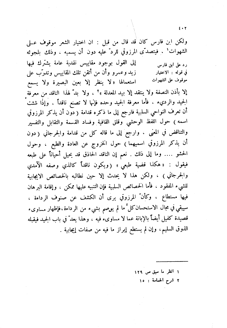 ولكن ابن فارس كان قد قال من قبل: أن اختيار الشعر موقوف على الشهوات (1) ، فيتصدى المرزوقي للرد دون أن يسميه، وذلك بلجوئه إلى القول بوجود مقاييس نقدية عامة يشترك فيها زيد وعمرو وأن من أتقن تلك المقاييس وتدرب على استعمالها " لا ينظر إلا بعين البصيرة ولا يسمع إلا بأذن النصفة ولا ينتقد إلا بيد المعدلة " (2) ، ولابد لهذا الناقد من معرفة الجيد والرديء، فأما معرفة الجيد وحده فإنها لا تصنع ناقداً، وإذا شئت أن تعرف النواحي السلبية فارجع إلى ما ذكره قدامة (دون أن يذكر المرزوقي اسمه) حول اللفظ الوحشي وقلق القافية وفساد القسمة والتقابل والتفسير والتناقض في المعنى، وارجع إلى ما قاله كل من قدامة والجرجاني (دون أن يذكر المرزوقي اسميهما) حول الخزرج عن العادة والطبع، وحول الحشو؟. وما إلى ذلك. نعم إن الناقد الحاذق قد يحيل أحياناً على طبعه فيقول: " هكذا قضية طبعي " (ويكون ناقداً كالذي وصفه الآمدي والجرجاني) ، ولكن هذا لا يحدث إلا حين نطالبه بالخصائص الإيجابية للشيء المفقود، فأما الخصائص السلبية فإن التنبيه عليها ممكن، وإقامة البرهان فيها مستطاع، وكان المرزوقي يرى ان الكشف عن صنوف الرداءة، سيبقي في مجال الاستحسان كل ما لم يوصم بشيء من الرداءة، فإظهار مساوئ قصيدة كفيل أيضاً بالإبانة عما لا مساوئ فيه، وهذا يعد في باب الجيد فيقبله الذوق السليم، وإن لم يستطع إبراز ما فيه من صفات إيجابية.