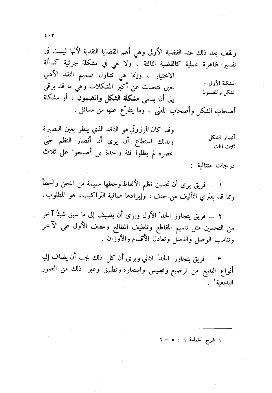 ونقف بعد ذلك عند القضية الأولى وهي أهم القضايا النقدية لأنها ليست في تفسير ظاهرة عملية كالقضية الثالثة، ولا هي في مشكلة جزئية كمسألة الاختيار، وإنما هي تتناول صميم النقد الأدبي حين تتحدث عن أكبر المشكلات وهي ما قد يرقى إلى أن يسمى مشكلة الشكل والمضمون، أو مشكلة أصحاب الشكل وأصحاب المعنى، وما يتفرع عنها من مسائل.