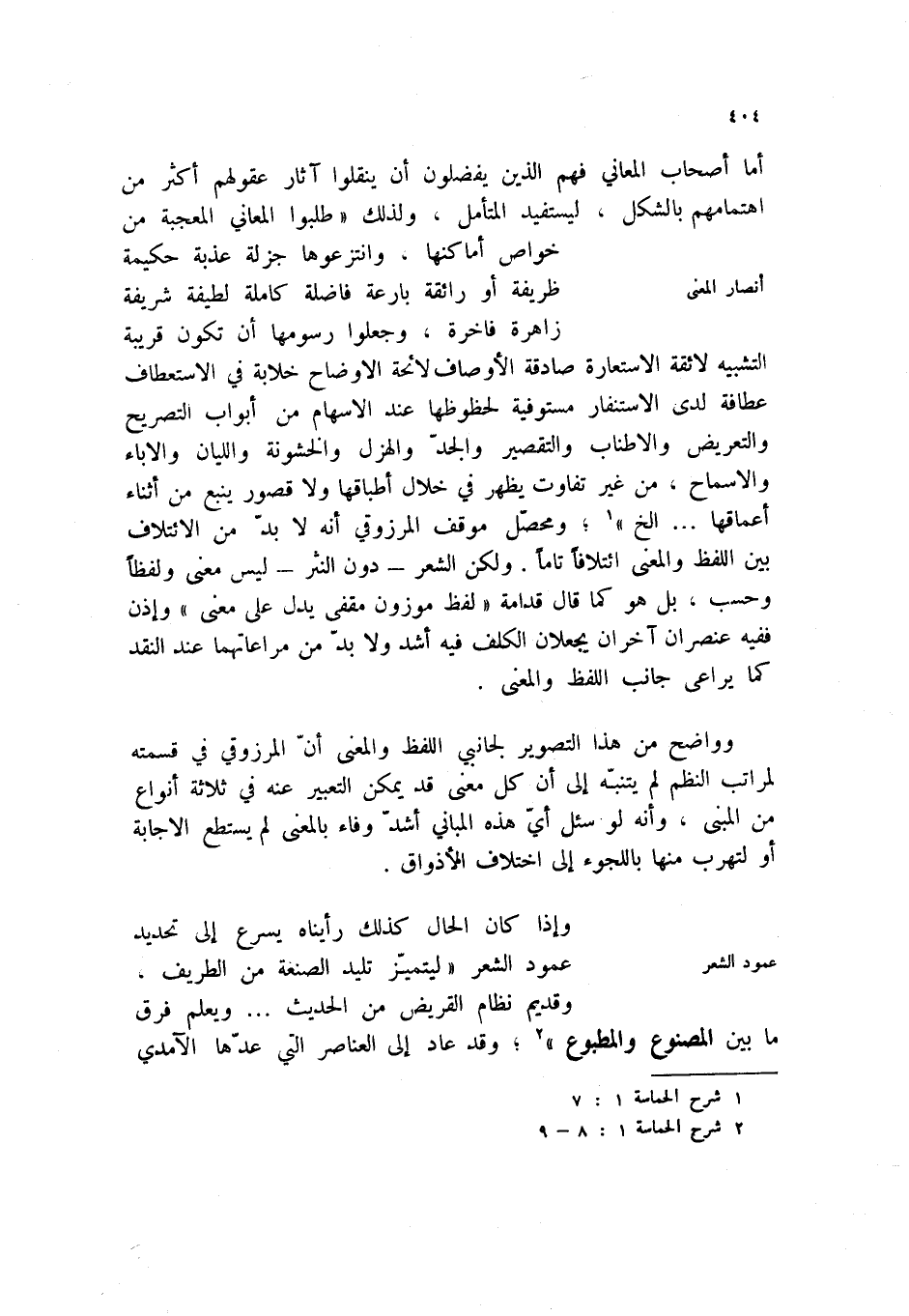 أما أصحاب المعاني فهم الذين يفضلون أن ينقلوا آثار عقولهم أكثر من اهتمامهم بالشكل، ليستفيد المتأمل، ولذلك " طلبوا المعاني المعجمة من خواص أماكنها، وانتزعوها جزلة عذبة حكيمة ظريفة أو رائقة بارعة فاضلة كاملة لطيفة شريفة زاهرة فاخرة، وجعلوا رسومها ان تكون قريبة التشبيه لائقة الاستعارة صادقة الأوصاف لائحة الأوضاع خلابة في الاستعطاف عطافة لدى الاستنفار مستوفية لحظوظها عند الإسهام من أبواب التصريح والتعريض والإطناب والتقصير والجد والهزل والخشونة والليان والإباء والإسماح، من غير تفاوت يظهر في خلال أطباقها ولا قصور ينبع من أثناء أعماقها؟ الخ " (1) ؛ ومحصل موقف المرزوقي انه لا بد من الائتلاف بين اللفظ والمعنى ائتلافاً تاماً. ولكن الشعر - دون النثر - ليس معنى ولفظاً وحسب، بل هو كما قال قدامة " لفظ موزون مقفى يدل على معنى " وإذن ففيه عنصران آخران يجعلان الكلف فيه أشد ولابد من مراعاتهما عند النقد كما يراعى جانب اللفظ والمعنى.