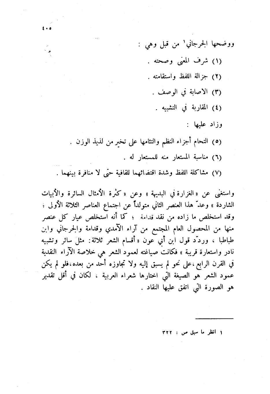 واستغنى عن " الغزارة في البديهة " وعن (كثرة الأمثال السائرة والأبيات الشاردة " وعد هذا العنصر الثاني متولداً عن اجتماع العناصر الثلاثة الأولى وقد استخلص ما زاده من نقد قدامة؛ كما انه استخلص عيار كل عنصر منها من الحصول العام المجتمع من آراء الآمدي وقدامة والجرجاني وابن طباطبا، وردد قول ابن أبي عون " أقسام الشعر ثلاثة: مثل سائر وتشبيه نادر واستعارة قريبة " فكانت صياغته لعمود الشعر هي خلاصة الآراء النقدية في القرن الرابع، على نحو لم يسبق إليه ولا تجاوزه أحد من بعده، فلو لم يكن عمود الشعر هو الصيغة التي اختارها شعراء العربية، لكان في أقل تقدير هو الصورة التي اتفق عليها النقاد.