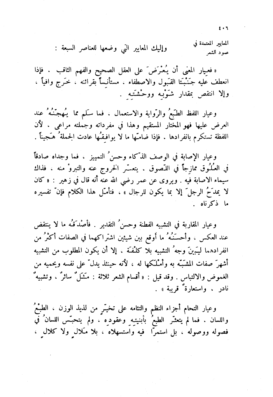 وعيار الإصابة في الوصف الذكاء وحسن التمييز، فما وجداه صادقاً في العلوق ممازجاً في اللصوق، يتعسر الخروج عنه والتبرو منه، فذاك سيماء الإصابة فيه. ويروى عن عمر رضي الله عنه انه قال في زهير: " كان لا يمدح الرجل إلا بما يكون للرجال "، فتأمل هذا الكلام فإن تفسيره ما ذكرناه.