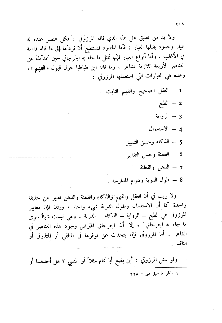 ولا ريب في أن العقل والفهم والذكاء والفطنة والذهن تعبير عن حقيقة واحدة كما أن الاستعمال وطول الدربة شيء واحد؛ وإذن فإن معايير المرزوقي هي الطبع - الرواية - الذكاء - الدربة. وهي ليست شيئاً سوى ما جاء به الجرجاني (1) ؛ إلا أن الجرجاني افترض وجود هذه العناصر في الشاعر، أما المرزوقي فإنه يتحدث عن توفرها في المتلقي أو المتذوق أو الناقد.