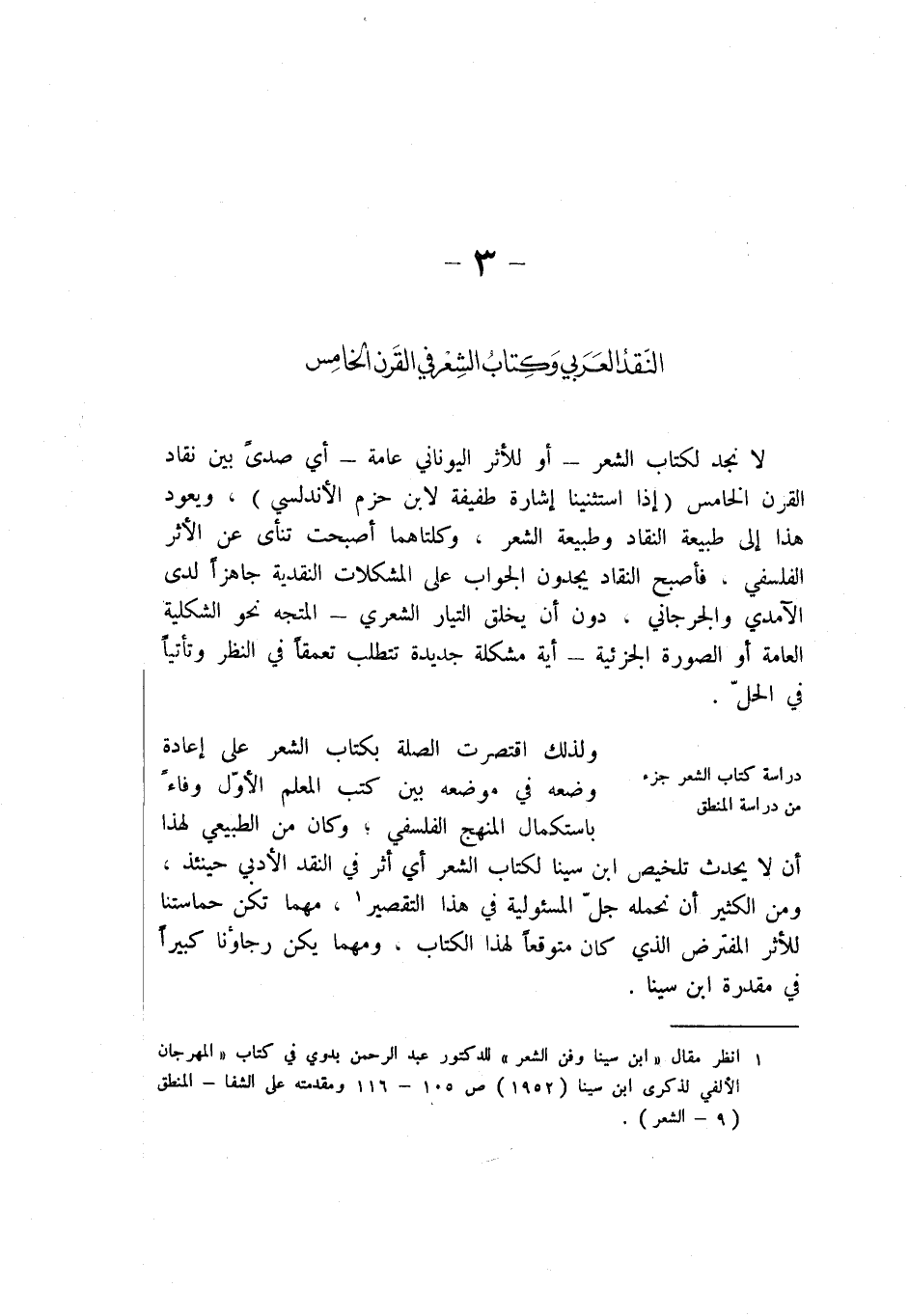 (1) أنظر مقال " ابن سينا وفن الشعر " للدكتور عبد الرحمن البدوي في كتاب " المهرجان الألفي لذكرى ابن سينا (1952) ص 105 - 116 ومقدمته على الشفا - المنطق (9 - الشعر) .