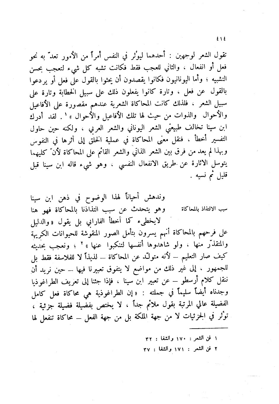 وندهش أحياناً لهذا الوضوح في ذهن ابن سينا وهو يتحدث عن سبب التذاذنا بالمحاكاة فهو هنا لا يخطئ كما اخطأ الفارابي بل يقول " والدليل على فرحهم بالمحاكاة انهم يسرون بتأمل الصور المنقوشة للحيوانات الكريهة والمتقذر منها، ولو شاهدوها أنفسها لتنكبوا عنها " (2) ؛ ونعجب بحديثه كيف صار التعليم - لأنه متولد عن المحاكاة - لذيذاً لا للفلاسفة فقط بل للجمهور، إلى غير ذلك من مواضع لا يتفوق تعبيرنا فيها - حين نريد ان ننقل كلام أرسطو - عن تعبير ابن سينا، فإذا جئنا إلى تعريف الطراغوذيا وجدناه أيضاً سليماً في جملته: " عن الطراغوذية هي محاكاة فعل كامل الفضيلة عالي المرتبة بقول ملائم جداً، لا يختص بفضيلة فضيلة جزئية، تؤثر في الجزئيات لا من جهة الملكة بل من جهة الفعل - محاكاة تنفعل لها
