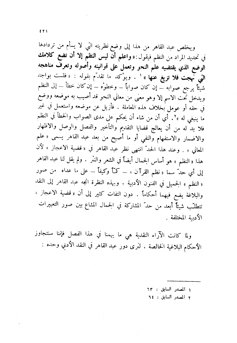 ويخلص عبد القاهر من هذا إلى وضع نظريته التي لا يسأم من تردادها في تحديد المراد من النظم فيقول: " وعلم أن ليس النظم إلا أن تضع كلامك الوضع الذي يقتضيه علم النحو وتعمل على قوانينه وأصوله وتعرف مناهجه التي نهجت فلا تزيغ عنها " (1) ، ويؤكد ما تقدم بقوله: " فلست بواجد شيئاً يرجع صوابه - إن كان صواباً - وخطوه - عن كان خطأ - إلى النظر ويدخل تحت الاسم إلا وهو معنى من معاني النحو قد أصيب به موضعه ووضع في حقه أو عوامل بخلاف هذه المعاملة، فأزيل عن موضعه واستعمل في غير ما ينبغي له " (2) ، أي أن من شاء أن يحكم على مدى الصواب والخطأ في النظم فلابد له من أن يعالج قضايا التقديم والتأخير والفصل والوصل والإظهار والإضمار والاستفهام والنفي أو ما أصبح من بعد عبد القاهر يسمى " علم المعاني ". وعند هذا الحد انتهى نظر عبد القاهر في " قضية الإعجاز " لان هذا " النظم " هو أساس الجمال أيضاً في الشعر والنثر، ولم يقل لنا عبد القاهر إلى أي حد سما " نظم القرآن " - كماً وكيفاً - على ما عداه من صور " النظم " الجميل في الفنون الأدبية؛ وبهذه النظرة اتجه عبد القاهر إلى النقد والبلاغة يضع فيهما أحكاماً، دون التفات كثير إلى أن " قضية الإعجاز " تتطلب شيئاً أبعد من حد المشاركة في الجمال المشاع بين صور التعبيرات الأدبية المختلفة.