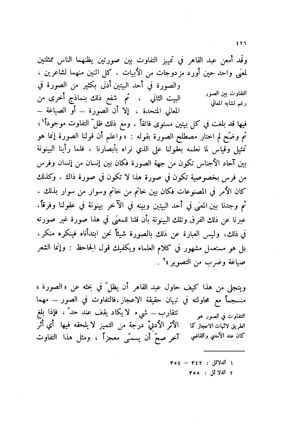 ويتجلى من هذا كيف حاول عبد القاهر أن يظل في بحثه عن " الصورة " منسجماً مع محاولته في تبيان حقيقة الغعجاز، فالتفاوت في الصور - مهما تتقارب - شيء لا يكاد يقف عند حد، فإذا بلغ الأثر الأدبي درجة من التمييز لا يلحقه فيها أي اثر آخر صح أن يسمى معجزاً، ومثل هذا التفاوت