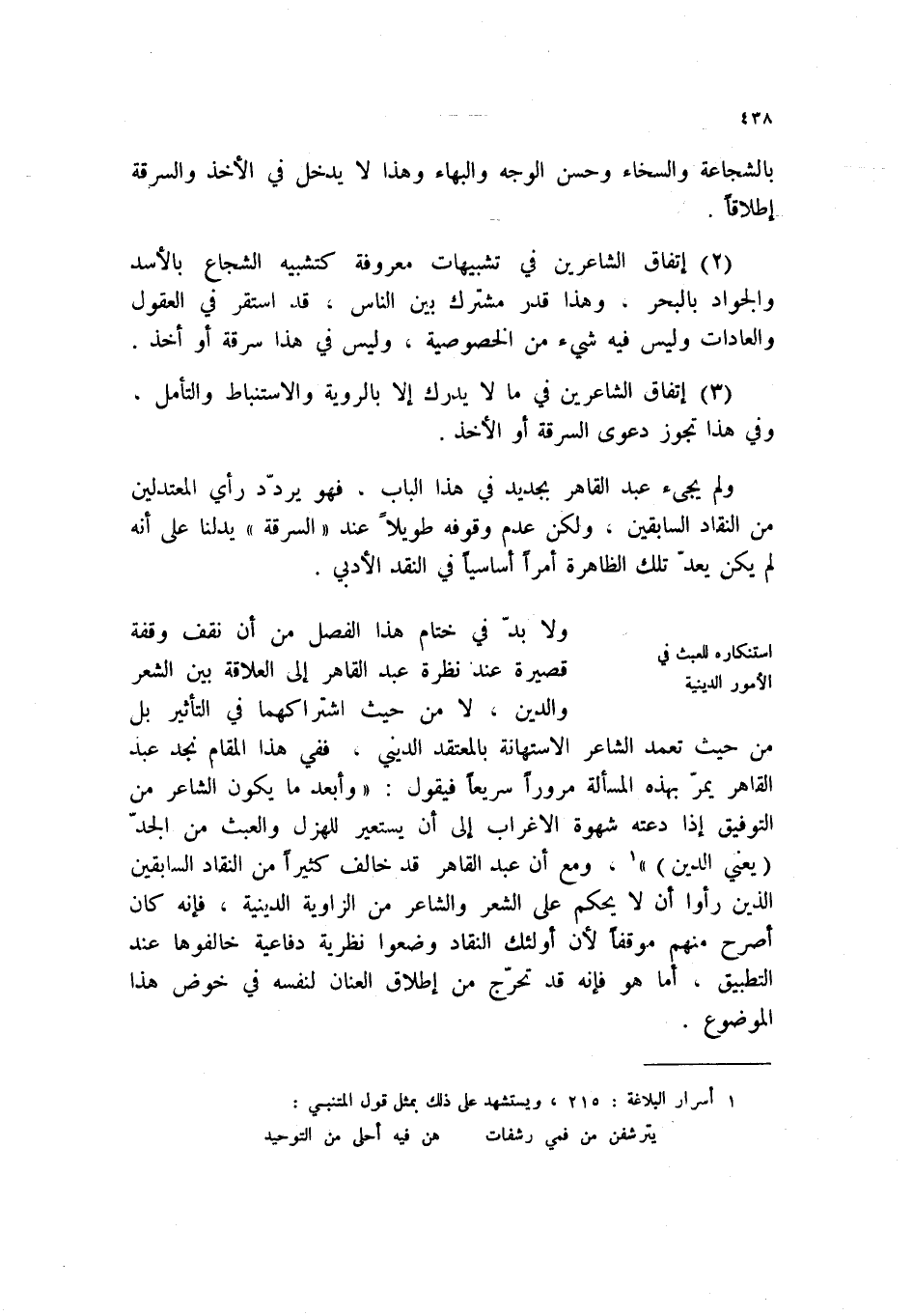 ولم يجيء عبد القاهر بجديد في هذا الباب، فهو يردد رأي المعتدلين من النقاد السابقين، ولكن عدم وقوفه طويلاً عند " السرقة " يدلنا على انه لم يكن يعد تلك الظاهرة أمراً أساسياً في النقد الأدبي.