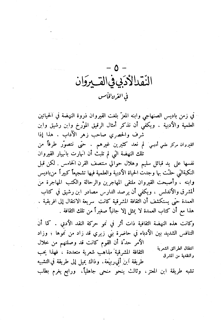 في زمن باديس الصنهاجي وابنه المعز بلغت القيروان ذروة النهضة في الحياتين العلمية والأدبية، ويكفي أن نذكر أمثال الرقيق المؤرخ وابن رشيق وابن شرف والحصري صاحب زهر الآداب، هذا إذا لم نعد كثيرين غيرهم. حتى نتصور طرفاً من تلك النهضة التي لم تلبث أن انهارت بانهيار القيروان نفسها على يد قبائل سليم وهلال حوالي منتصف القرن الخامس. لكن قبل النكبة التي حلت بها وجدت الحياة الأدبية والعلمية فيها تشجيعاً كبيراً من باديس وابنه، وأصبحت القيروان ملتقى المهاجرين والرحالة والكتب المهاجرة من المشرق والأندلس، ويكفي أن يرصد الدارس مصادر ابن رشيق في كتاب العمدة حتى يستكشف ان الثقافة المشرقية كانت سريعة الانتقال إلى افريقية، هذا مع أن كتاب العمدة لا يمثل إلا جانباً صغيراً من تلك الثقافة.