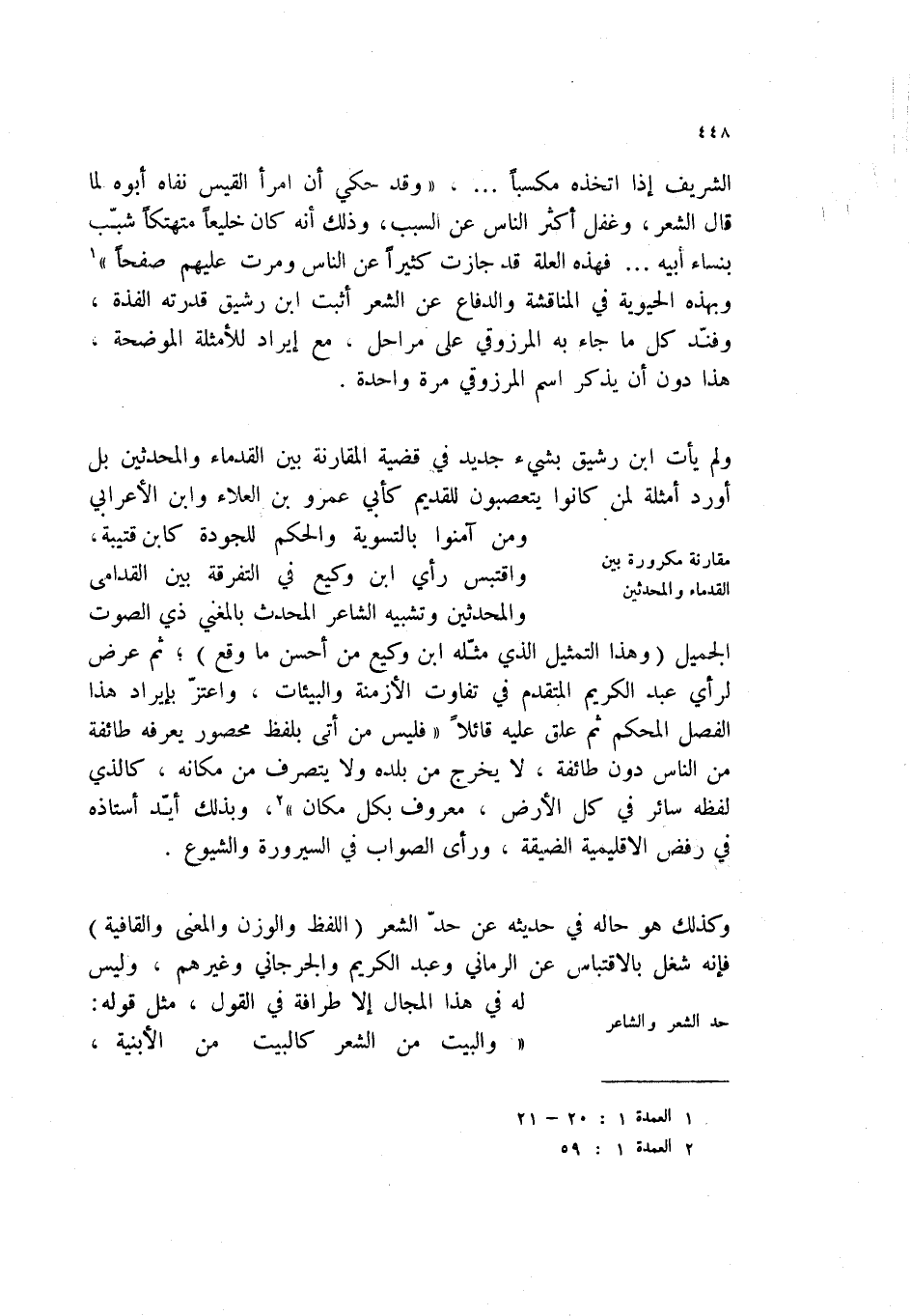 الشريف إذا اتخذه مكسياً؟، " وقد حكي أن امرأ القيس نفاه أبوه لما قال الشعر، وغفل أكثر الناس عن السبب، وذلك انه كان خليعاً متهتكأ شبب بنساء أبيه؟ فهذه العلة قد جاوزت كثيراً عن الناس ومرت عليهم صفحاً " (1) وبهذه الحيوية في المناقشة والدفاع عن الشعر اثبت ابن رشيق قدرته الفذة، وفند كل ما جاء به المرزوقي على مراحل، مع إيراد للأمثلة الموضحة هذا دون أن يذكر اسم المرزوقي مرة واحدة.
