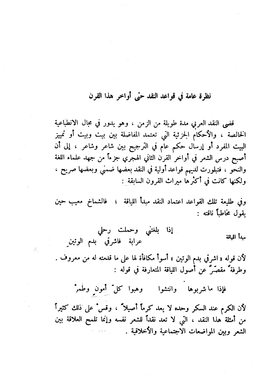 وفي طليعة تلك القواعد اعتماد النقد مبدأ اللياقة؛ فالشماخ معيب حين يقول مخاطباً ناقته: