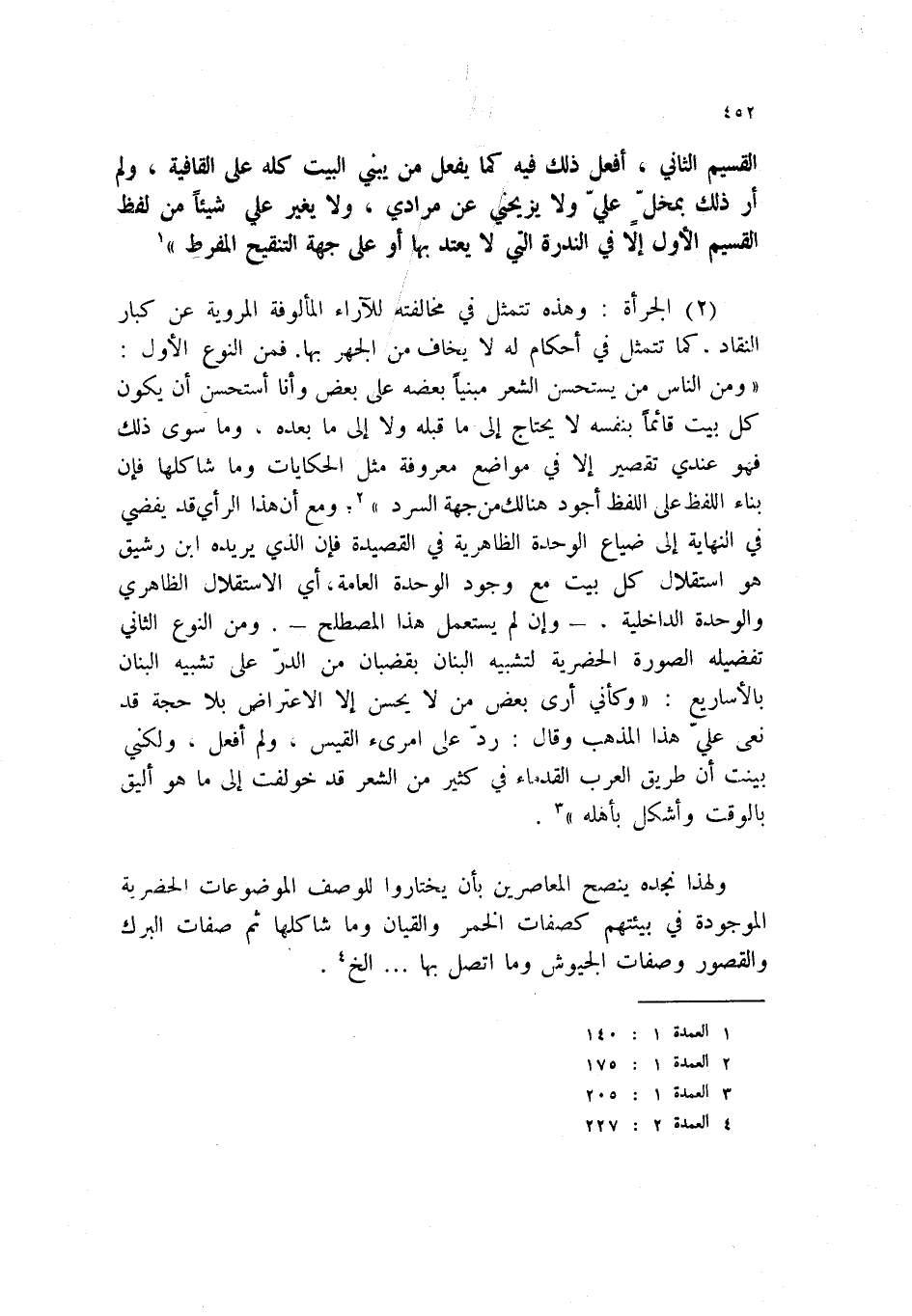 ولهذا نجده ينصح المعاصرين بان يختاروا للوصف الموضوعات الحضرية الموجودة في بيئتهم كصفات الخمر والقيان وما شاكلها ثم صفات البرك والقصور وصفات الجيوش وما اتصل بها؟ الخ (4) .