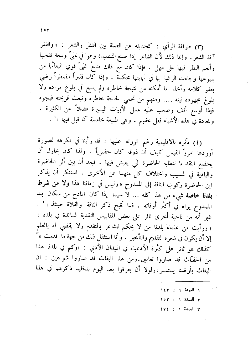 (4) تأثره بالإقليمية رغم ثورته عليها: قد رأينا في تكرهه لصورة أوردها أمرؤ القيس كيف أن ذوقه كان حضرياً. ولذا كان يحاول أن يخضع النقد لما تتطلبه الحاضرة التي يعيش فيها. فبعد أن بين اثر الحاضرة والبادية في النسيب واختلاف كل منهما عن الأخرى. استنكر أن يذكر ابن الحاضرة ركوب الناقة إلى الممدوح " وليس في زماننا هذا ولا من شرط بلدنا خاصة شيء من هذا كله؟ لا سيما إذا كان المادح من سكان بلد الممدوح يراه في أكثر أوقاته، فما أقبح ذكر الناقة والفلاة حينئذ " (2) . غير أنه من ناحية أخرى ثائر على بعض المقاييس النقدية السائدة في بلده: " ورأيت من علماء بلدنا من لا يحكم للشاعر بالتقدم ولا يقضي له بالعلم إلا أن يكون في شعره التقديم والتأخير. وأنا استثقل ذلك من جهة ما قدمت " (3) كذلك هو ثائر على كثرة الأدعياء في الميدان الأدبي: (وكم في بلدنا هذا من الخفاث قد صاروا ثعابين. ومن هذا البغاث قد صاروا شواهين: أن البغاث بأرضنا يستنسر، ولولا أن يعرفوا بعد اليوم بتخليد ذكرهم في هذا