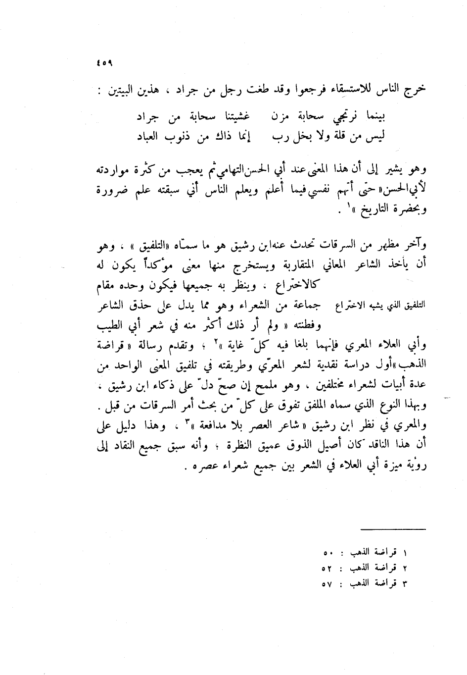 ليس من قلة ولا بخل رب ... إنما ذاك من ذنوب العباد وهو يشير إلى ان هذا المعنى عند أبي الحسن التهامي ثم يعجب من كثرة مواردته لأبي الحسن " حتى اتهم نفسي فيما أعلم ويعلم الناس إني سبقته علم ضرورة وبحضرة التاريخ " (1) .