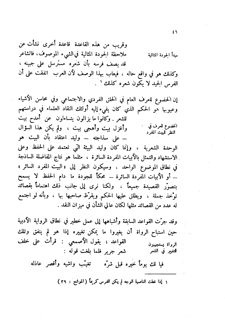 إن الخضوع للعرف العام في الخلق الفردي والاجتماعي وفي محاسن الأشياء وعيوبها هو الحكم الذي كان يفيء إليه أولئك النقاد العلماء في دراستهم للشعر. وكانوا ما يزالون يتساءلون عن أمدح بيت وأغزل بيت وأهجى بيت، ولم يكن هذا السؤال؟ على سذاجته - وليد اعتقاد بان البيت هو الوحدة الشعرية، وإنما كان وليد البيئة التي تعتمد على الحفظ وعلى الاستشهاد والتمثل بالأبيات المفردة السائرة، مثلما هو نتاج المفاضلة الساذجة في نطاق الموضوع الواحد، وسيكون النظر إلى " البيت المفرد السائر "؟ أو الأبيات المفردة السائرة - محكاً للجودة ما دام الحفظ لا يسمح بتصور القصيدة جميعاً، ولكنا نرى إلى جانب ذلك اهتماماً بقصائد تؤخذ جملة، ويطلق عليها الحكم ويقرظ صاحبها بها، وبأنه لو اجتمع له عدد من القصائد مثلها لكان عالي الشأن في ميزان النقد.