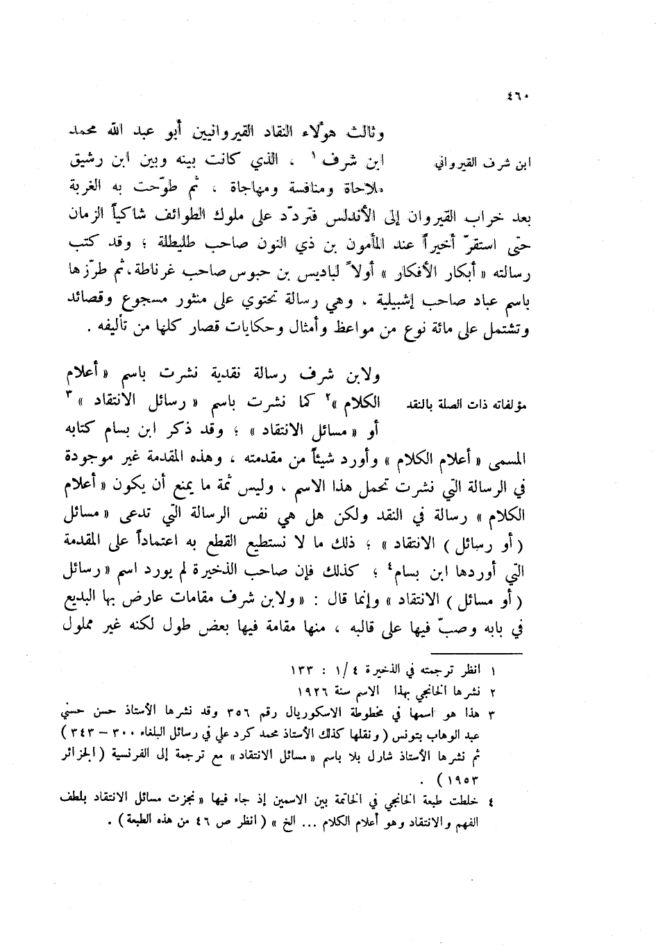 (3) هذا هو اسمها في مخطوطة الاسكوريال رقم 356 وقد نشرها الأستاذ حسن حسني عبد الوهاب بتونس (ونقلها كذلك الأستاذ محمد كرد علي في رسائل البلغاء 300 - 343) ثم نشرها الأستاذ شارل بلا باسم " مسائل الانتقاد " مع ترجمة إلى الفرنسية (الجزائر 1953) .