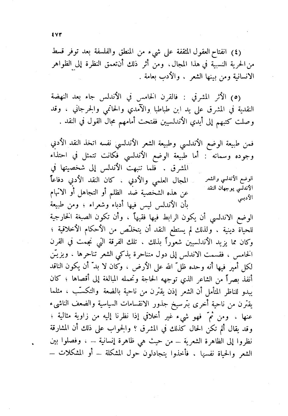 (4) انفتاح العقول المثقفة على شيء من المنطق والفلسفة بعد توفر قسط من الحرية النسبية في هذا المجال، ومن اثر ذلك ان تعمق النظرة إلى الظواهر الإنسانية ومن بينها الشعر، والأدب بعامة.