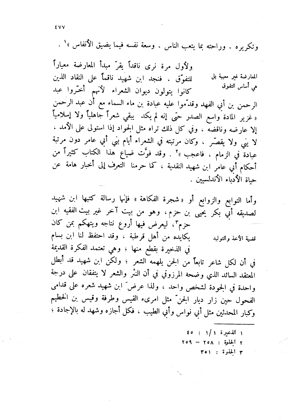 ولأول مرة نرى ناقداً يقر مبدأ المعارضة معياراً للتفوق، فنجد ابن شهيد ناقماً على النقاد الذين كانوا يتولون ديوان الشعراء لأنهم أخروا عبد الرحمن بن أبي الفهد وقدموا عليه عبادة بن ماء السماء مع ان عبد الرحمن " غزير المادة واسع الصدر حتى انه لم يكد يبقى شعراً جاهلياً ولا إسلامياً إلا عارضه وناقضه، وفي كل ذلك تراه مثل الجواد إذا استولى على الأمد، لا يني ولا يقصر، وكان مرتبته في الشعراء أيام بني أبي عامر دون مرتبة عبادة في الزمام، فاعجب " (2) . وقد فوت ضياع هذا الكتاب كثيراً من أحكام أبي عامر ابن شهيد النقدية، كما حرمنا التعرف إلى أخبار هامة عن حياة الأدباء الأندلسيين.