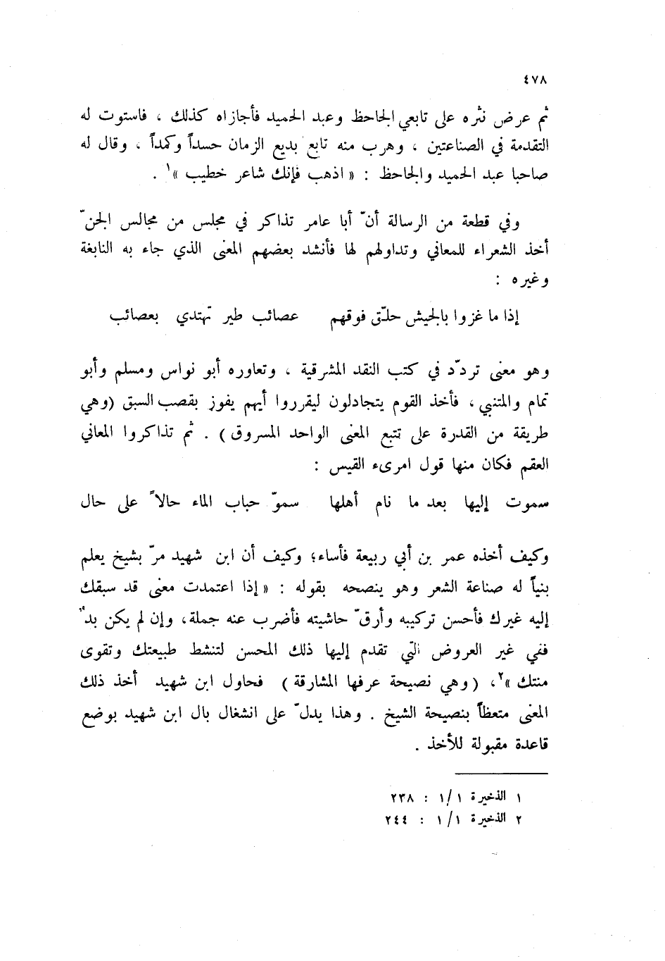 سموت إليها بعد ما نام أهلها ... سمو حباب الماء حالاً على حال وكيف أخذه عمر بن أبي ربيعة فأساء؛ وكيف أن ابن شهيد مر بشيخ يعلم بنياً له صناعة الشعر وهو ينصحه بقوله: " إذا اعتمدت معنى قد سبقك إليه غيرك فأحسن تركيبه وارق حاشيته فأضرب عنه جملة، وإن لم يكن بد ففي غير العروض التي تقدم غليها ذلك المحسن لتنشط طبيعتك وتقوى منتك " (2) ، (وهي نصيحة عرفها المشارقة) فحاول ابن شهيد أخذ ذلك المنى متعظاً بنصيحة الشيخ. وهذا يدل على انشغال بال ابن شهيد بوضع قاعدة مقبولة للأخذ.